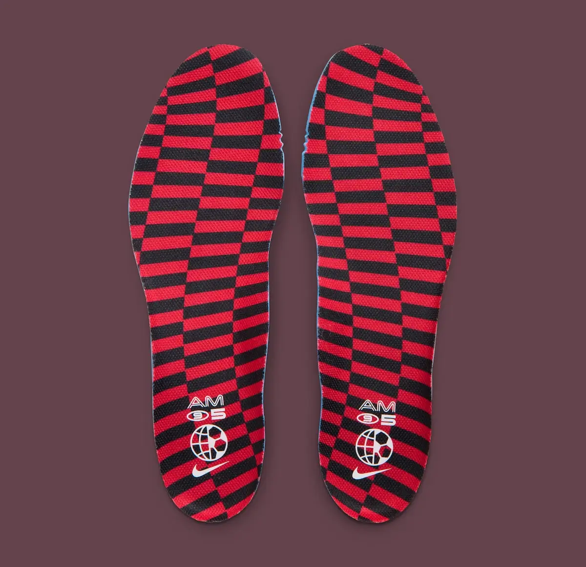 At its core, the silhouette remains anchored in the DNA of the Nike Air Max 95, a design originally conceived by Sergio Lozano. The layered upper, inspired by the human body’s musculature, continues to define the shoe’s structure. Yet here, that anatomy is reinterpreted through the lens of Total 90—a line synonymous with precision, power, and a distinctly early-2000s football aesthetic.