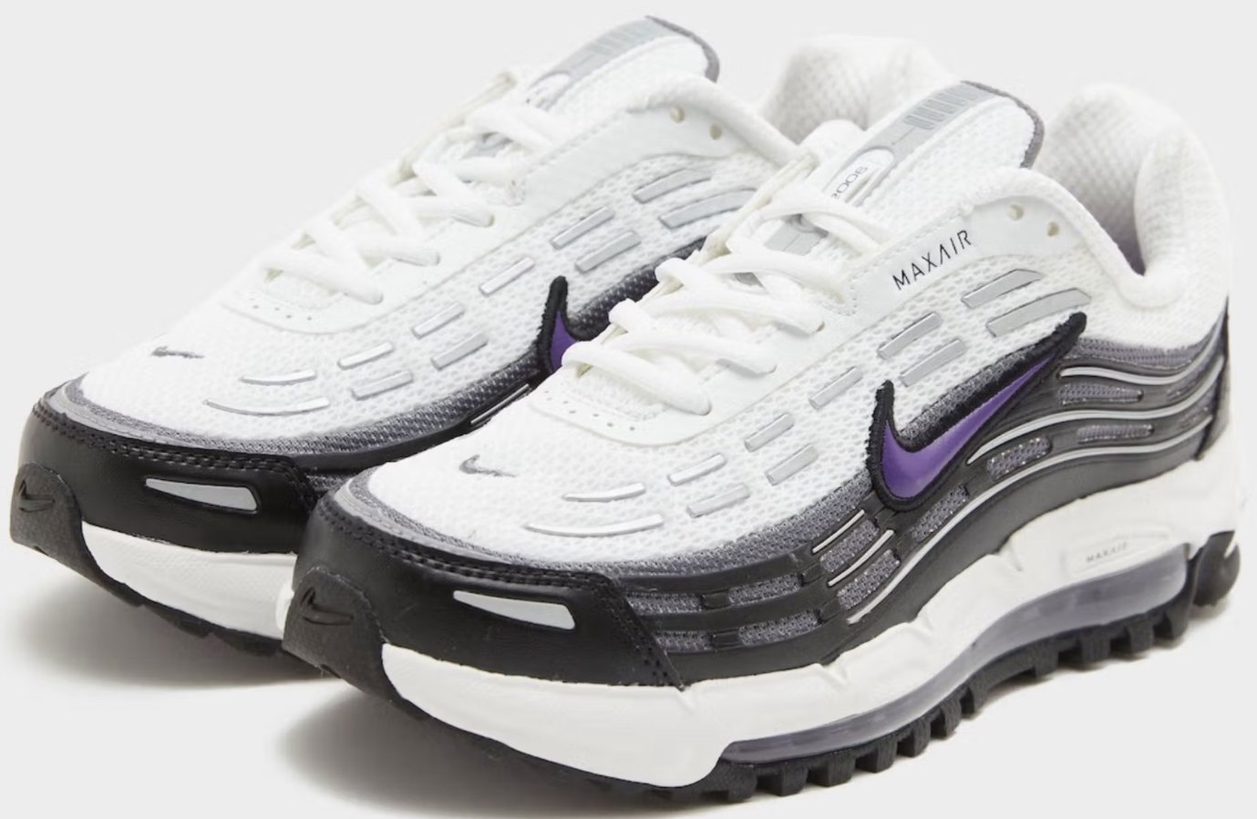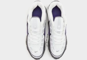 The TL 2.5 in this Wild Grape colorway retains the skeletal ribbing and layered mesh construction that defined its original release. The base is painted in a clean white, while strategic overlays in black create a contrasting structure. The dynamic midsole architecture evokes movement even while static—its full-length Air unit still futuristic in presence. These are not shoes that whisper their pedigree. They speak in defined, stylized vowels: speed, structure, sentiment.