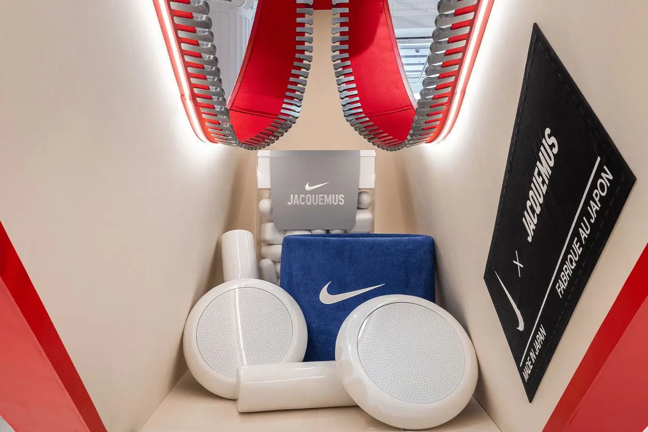 Inside the swoosh, the interior softened into playful gym-coded objects: glossy white forms reminiscent of weights and equipment, a plush blue block stamped with the swoosh, and a ribbed spine that mimicked the teeth of a zipper. The result was surreal but warm. It echoed Jacquesmus’ sense of humor while staying grounded in Nike’s performance roots.