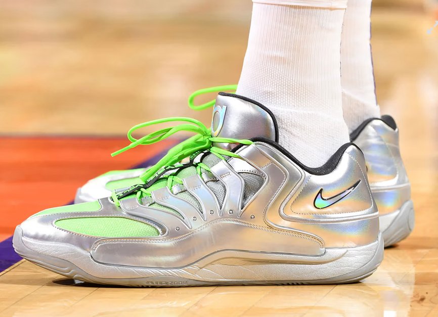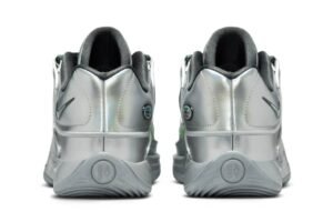The defining feature of this KD 18 iteration is its Metallic Silver upper, which shimmers under light and gives the shoe a futuristic tone that’s equal parts speed and sophistication. The use of Dark Smoke Grey along the midfoot and collar adds depth and contrast, acting as an anchor to balance the reflective finish.