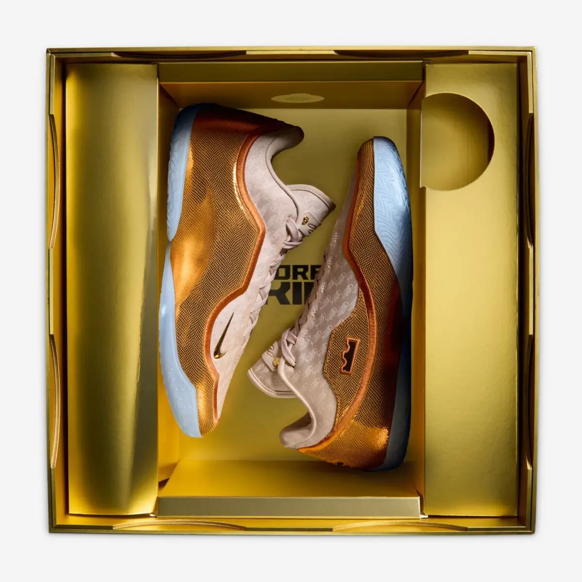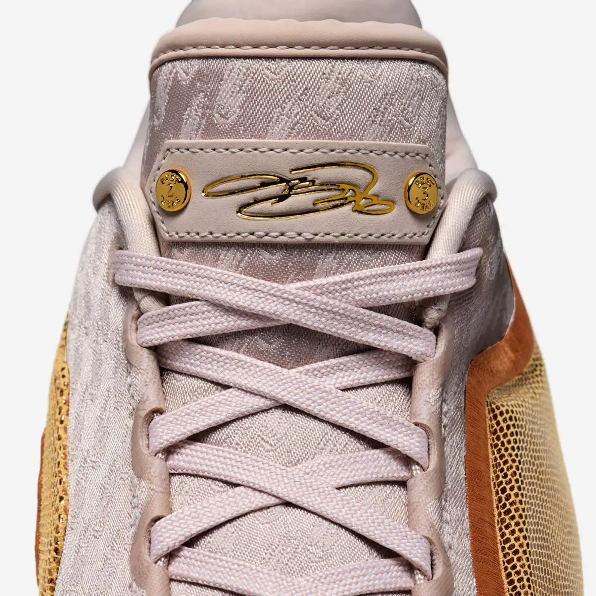 The “LeBronto” edition lends itself particularly well to this crossover appeal. Its neutral beige base pairs easily with contemporary streetwear silhouettes, while the metallic amber overlays introduce a statement element that catches the eye.