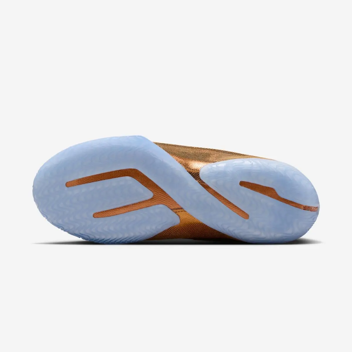Another striking feature is the translucent icy-blue outsole, which contrasts sharply with the warm upper tones. The cool tint not only enhances the shoe’s visual depth but also hints at the frozen intensity of postseason competition.