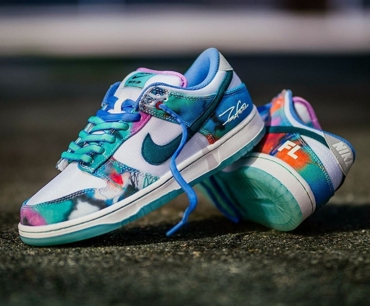 The Nike SB Dunk Low Futura Laboratories Bleached Aqua is a visual statement piece that immediately captures attention. The bleached canvas upper, combined with the teal suede Swoosh, provides a perfect backdrop for Futura’s signature abstract style. The multicolor overlays—reminiscent of graffiti art—are where the sneaker truly comes alive. These vibrant splashes of color embody the energy, spontaneity, and raw expression that characterize street art, making the sneaker not just a fashion statement, but a wearable piece of art.