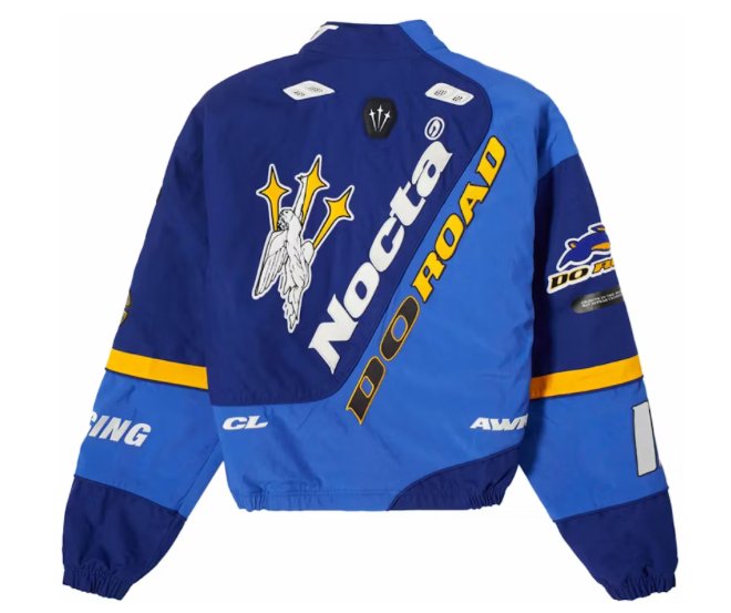 The collaboration is celebrated through prominent co-branding, with the L’Art Racing logo and NOCTA symbols featured on the sleeves, chest, sides, and back of the jacket. A large diagonal element on the back adds an extra touch of flair, making this piece an instant standout in any wardrobe.