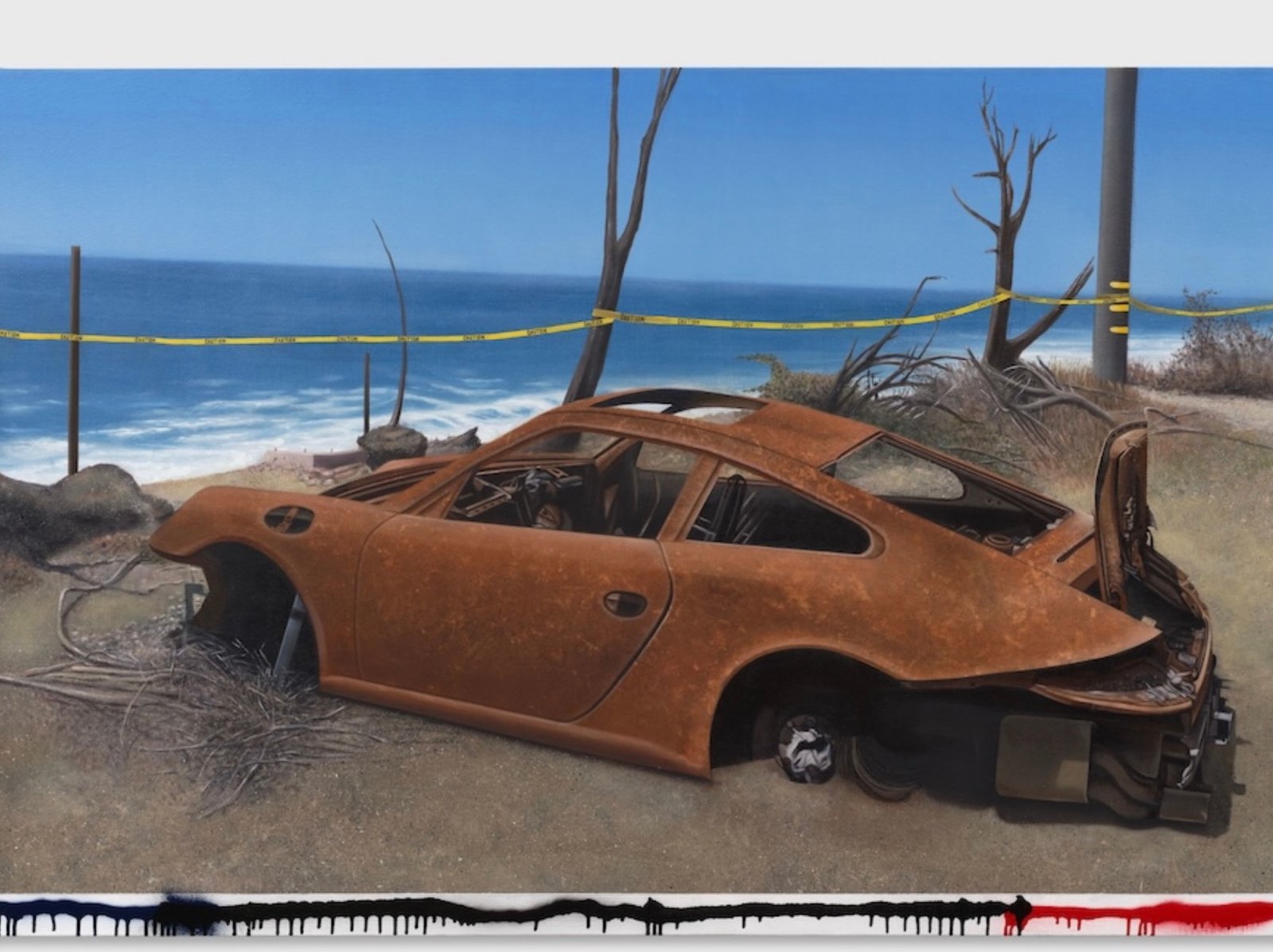 Tocco presents a Porsche destroyed by the Palisades Fire, gleaming like a relic against Malibu’s horizon. Beauty and devastation collapse into the same frame.