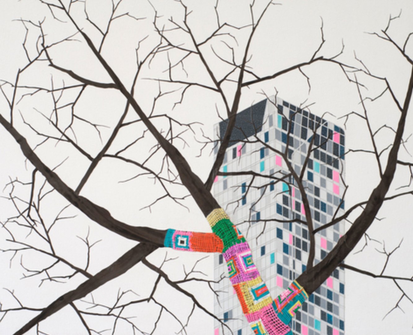Erik Benson’s 2015 artwork, “no title (Knit Bomb),” presents a compelling intersection of traditional craft and urban art. This piece portrays a leafless tree adorned with a vibrant knitted covering, set against the backdrop of a building speckled with pink, blue, and gray windows under a white-gray sky. Through this imagery, Benson explores themes of public space, creativity, and the nuanced line between art and vandalism.