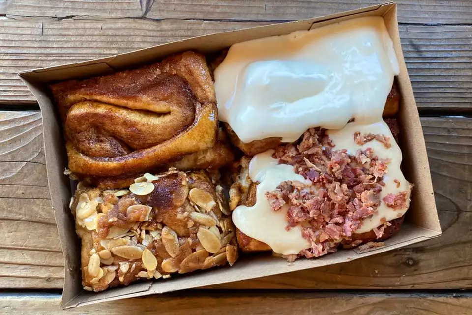 Of course, no cinnamon roll would be complete without a topping, and Old West Cinnamon Rolls gives customers plenty of options. While the classic cream cheese frosting is a fan favorite, the bakery also offers variations like maple frosting, nuts, raisins, and even a savory bacon-topped roll. This variety allows visitors to customize their cinnamon roll experience, ensuring there’s something for everyone.