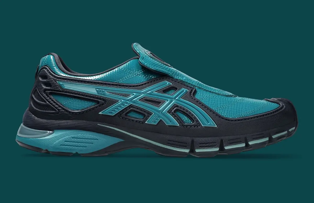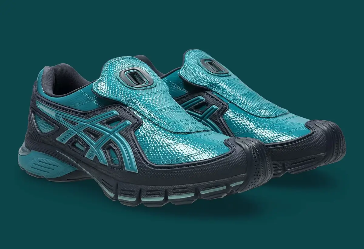 Two colorways anchor the release, each emphasizing different aspects of the design. The first arrives in a glossy teal finish, offset by black structural components. It’s the more expressive of the two, leaning into the sculptural nature of the silhouette. The sheen catches light in a way that amplifies the curves, making the shoe feel almost liquid in motion.