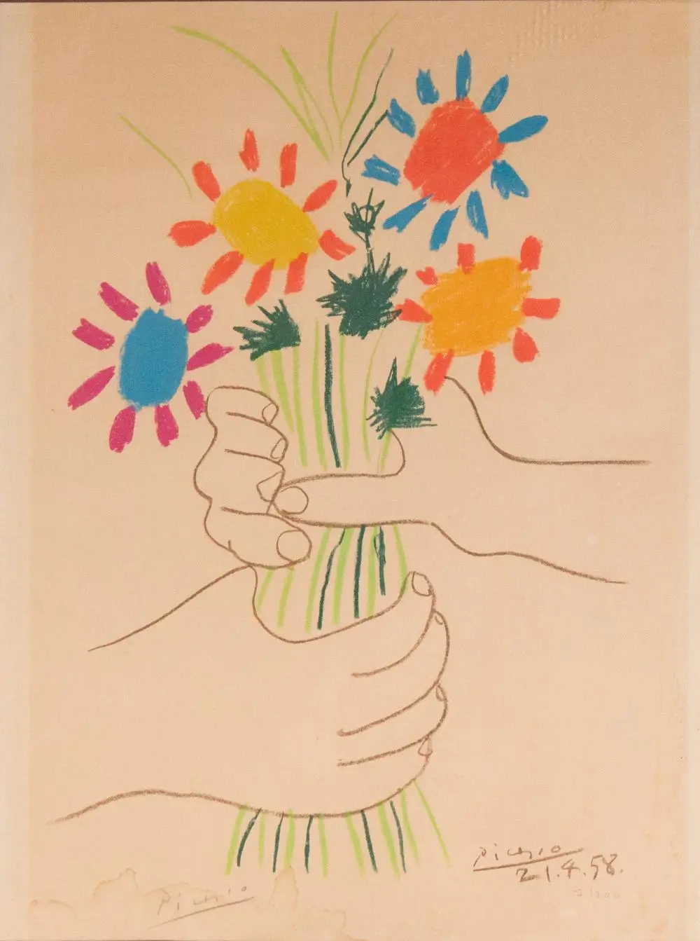 A cluster of brightly colored flowers rises from a bundle of stems, gathered together by several gently overlapping hands. The drawing is spare—almost casual—yet the image carries the unmistakable authority of one of the twentieth century’s most influential artists. Created in 1958, Bouquet of Peace captures the spirit of reconciliation and collective hope that shaped the later career of Pablo Picasso.