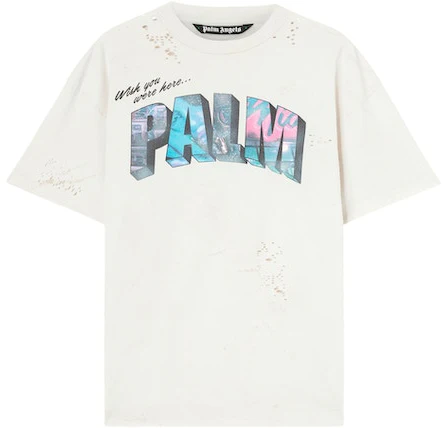 Above this main logo sits the phrase “Wish you were here…” — echoing the wistful charm of a handwritten postcard sent from a faraway vacation. This small detail transforms the shirt into more than a fashion piece; it becomes an emotional artifact, transporting the wearer into the world Palm Angels reveres.