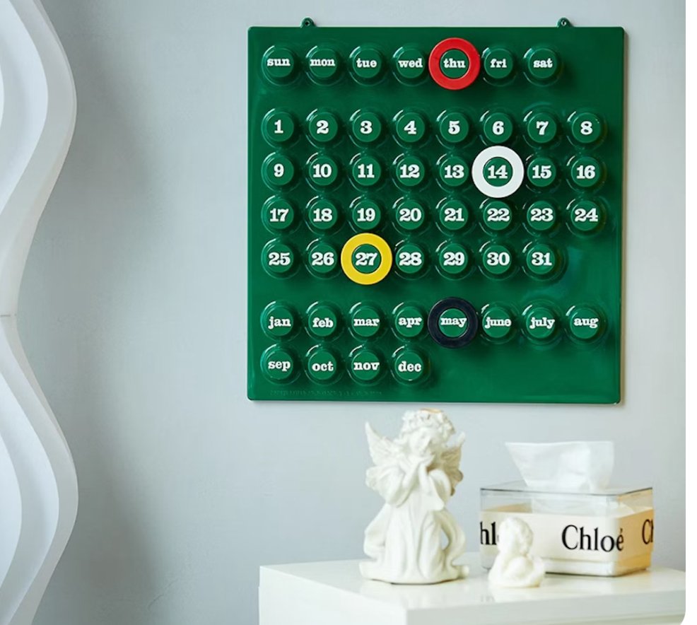 The calendar itself is constructed from lightweight but durable materials, designed to hang securely and seamlessly in any space—be it your kitchen, home office, hallway, or studio. Its clean green backdrop and bold typography are both practical and decorative. This is more than a tool for keeping track of days; it’s a conversation piece, a design object that elevates your interior with a sense of rhythm and clarity.