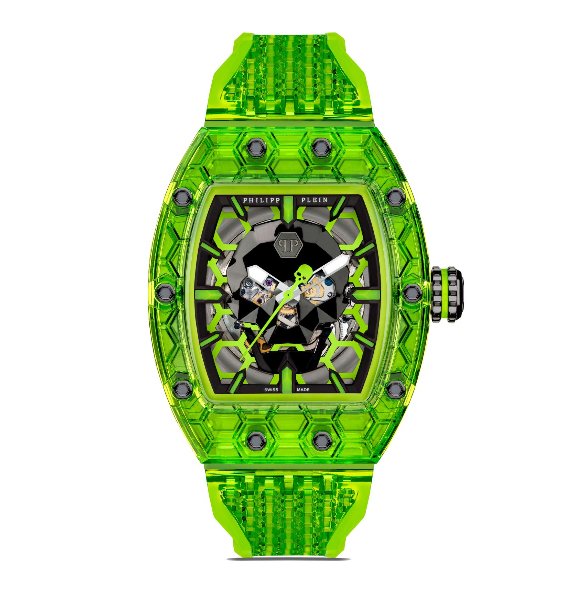 The fluorescent green hue and bold branding of the watch ensure it stands out as a statement piece, reinforcing Philipp Plein’s reputation for creating attention-grabbing designs.