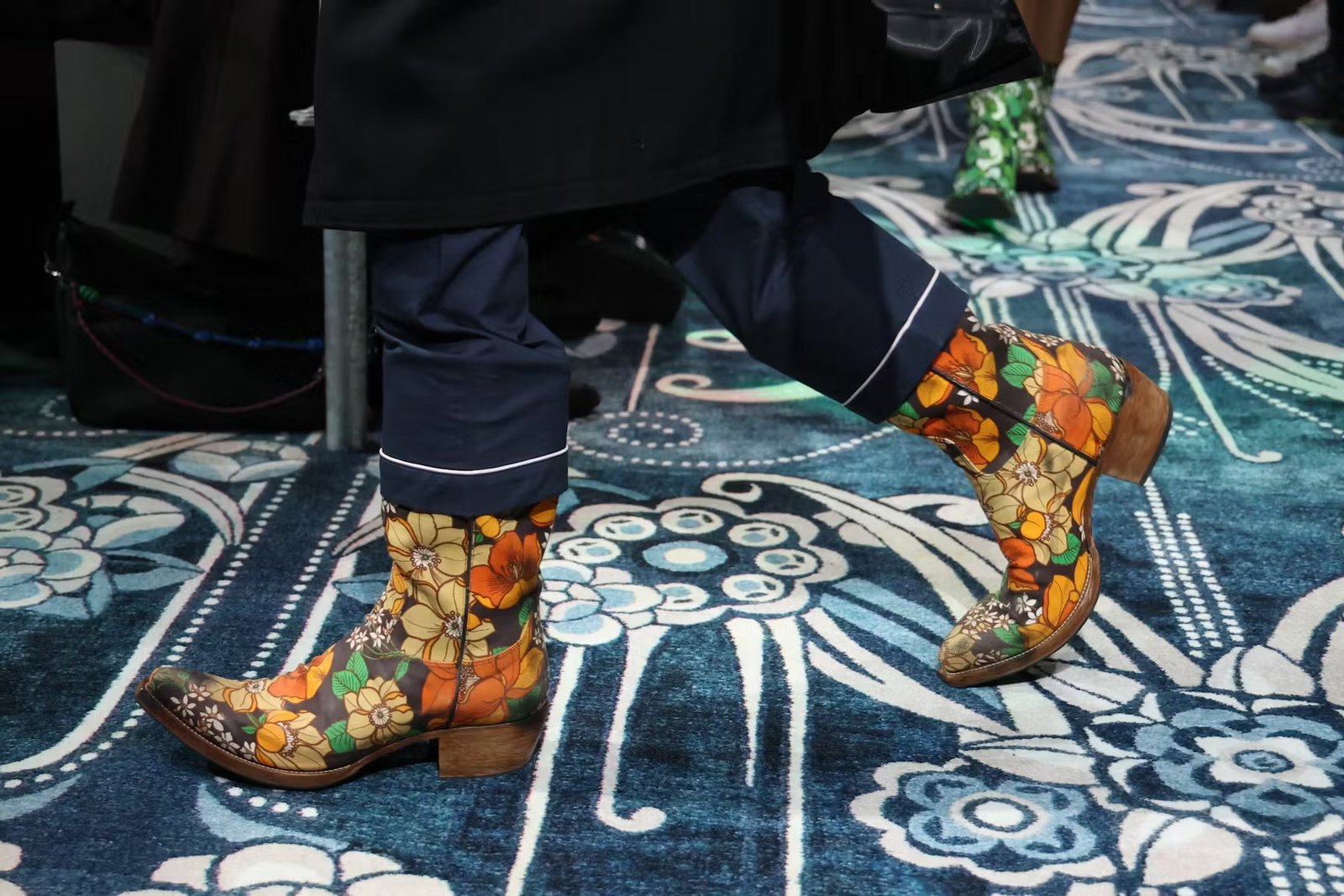 One of the most talked-about elements of the FW25 collection was Prada’s surprising embrace of cowboy boots. A bold departure from traditional menswear, the boots blended Prada’s penchant for reinvention with Western influences, offering a rugged yet polished aesthetic. Crafted in luxurious leathers and featuring intricate detailing, these boots were a statement piece that instantly elevated the collection to new heights of sartorial experimentation.