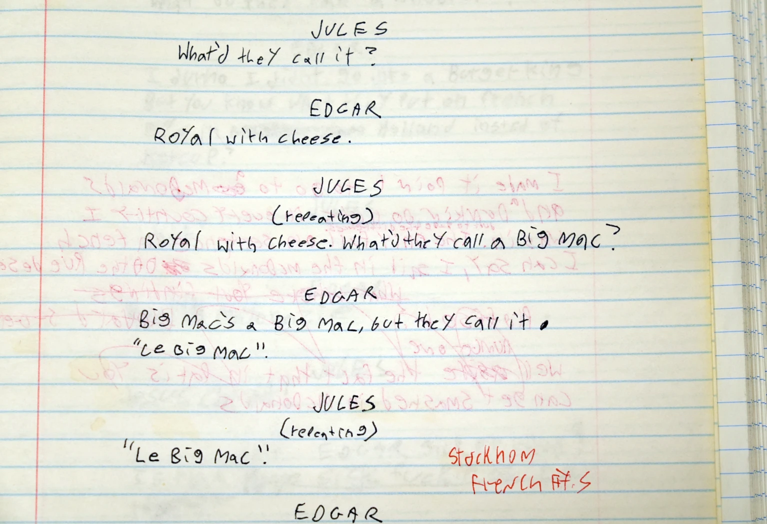 A handwritten draft of “Pulp Fiction” is more than an early version of a script—it’s a window into Tarantino’s evolving ideas, unpolished moments, and the creative energy that fueled one of his most iconic works. The draft reveals Tarantino’s distinctive writing style, including his love for rapid-fire dialogue and character quirks. Rough annotations, lines scratched out, and spontaneous notes capture the raw intensity of his creative process. Here, we see the early traces of iconic scenes like Jules and Vincent’s “Royale with Cheese” conversation, offering insight into the unfiltered mind behind the film.