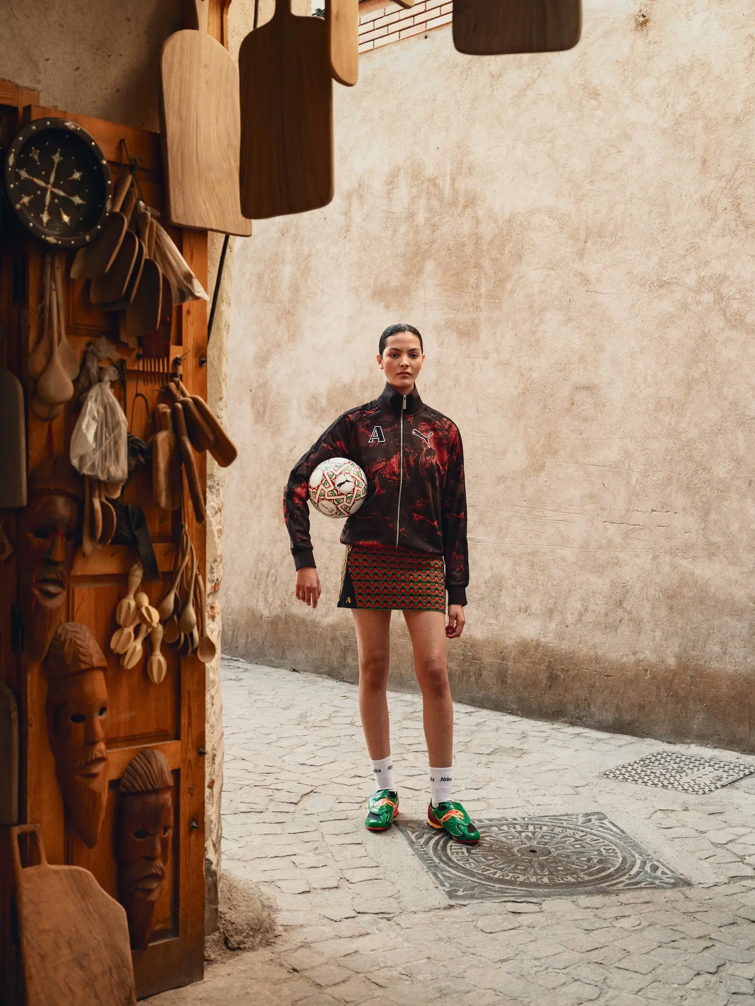 Ahluwalia’s creative process for this collection is grounded in lived experience. Traveling to Morocco and Nigeria—two nations with deeply rooted football traditions—she observed, listened, and documented.