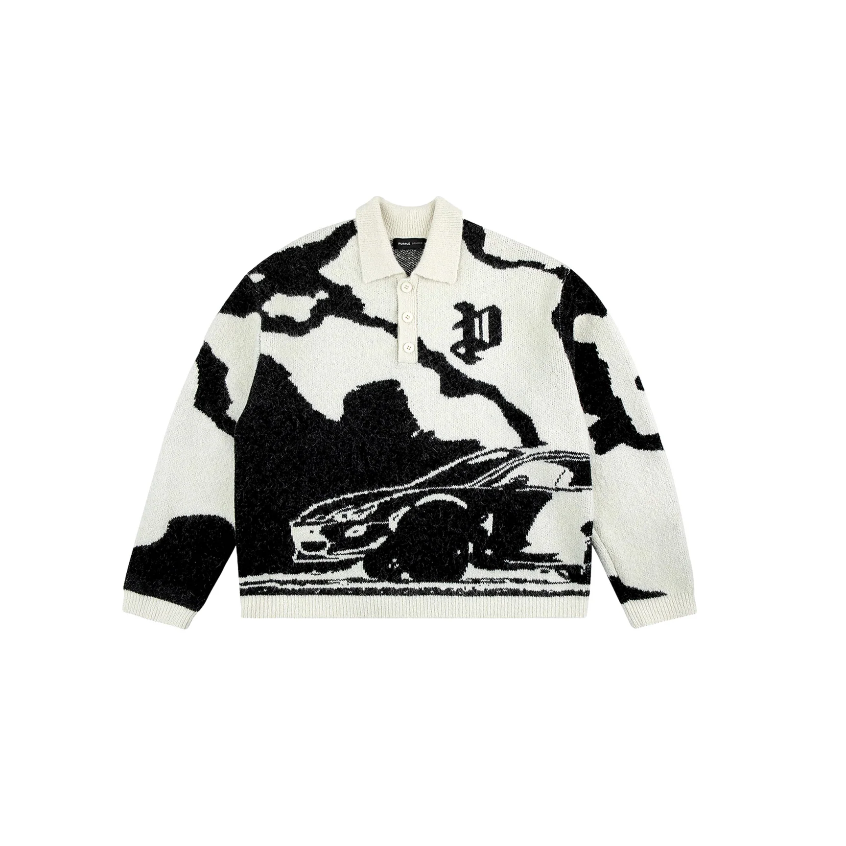 At first glance, the sweater is a powerful optical statement. Rendered in a monochromatic black and cream palette, the piece immediately evokes a sense of graphic intensity. The standout feature—a highly stylized sports car streaking across the lower half—anchors the design, while abstract swirling patterns across the chest and sleeves resemble smoke trails or drifting tire marks, reinforcing the adrenaline-soaked theme.