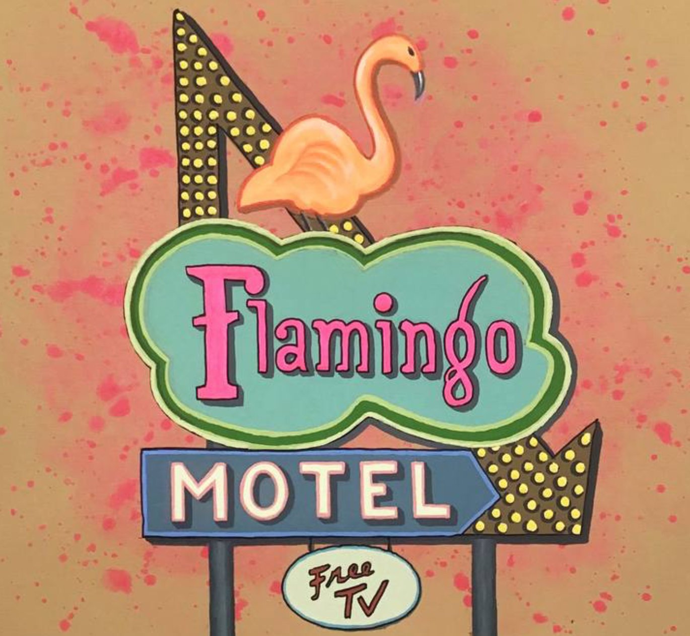 There is a particular shade of dusk in the American South and Southwest—lavender licked with coral, fading into a soft, bruised orange—that seems to exist only to be remembered. Flamingo Motel, Dusk captures this exact transition. The light is not theatrical; it is mournful, restrained. It falls across the parking lot like a benediction. The sky hums in the background but says nothing. No cars appear. No people move. There is only the hushed hum of anticipation, the stillness before a neon buzz.