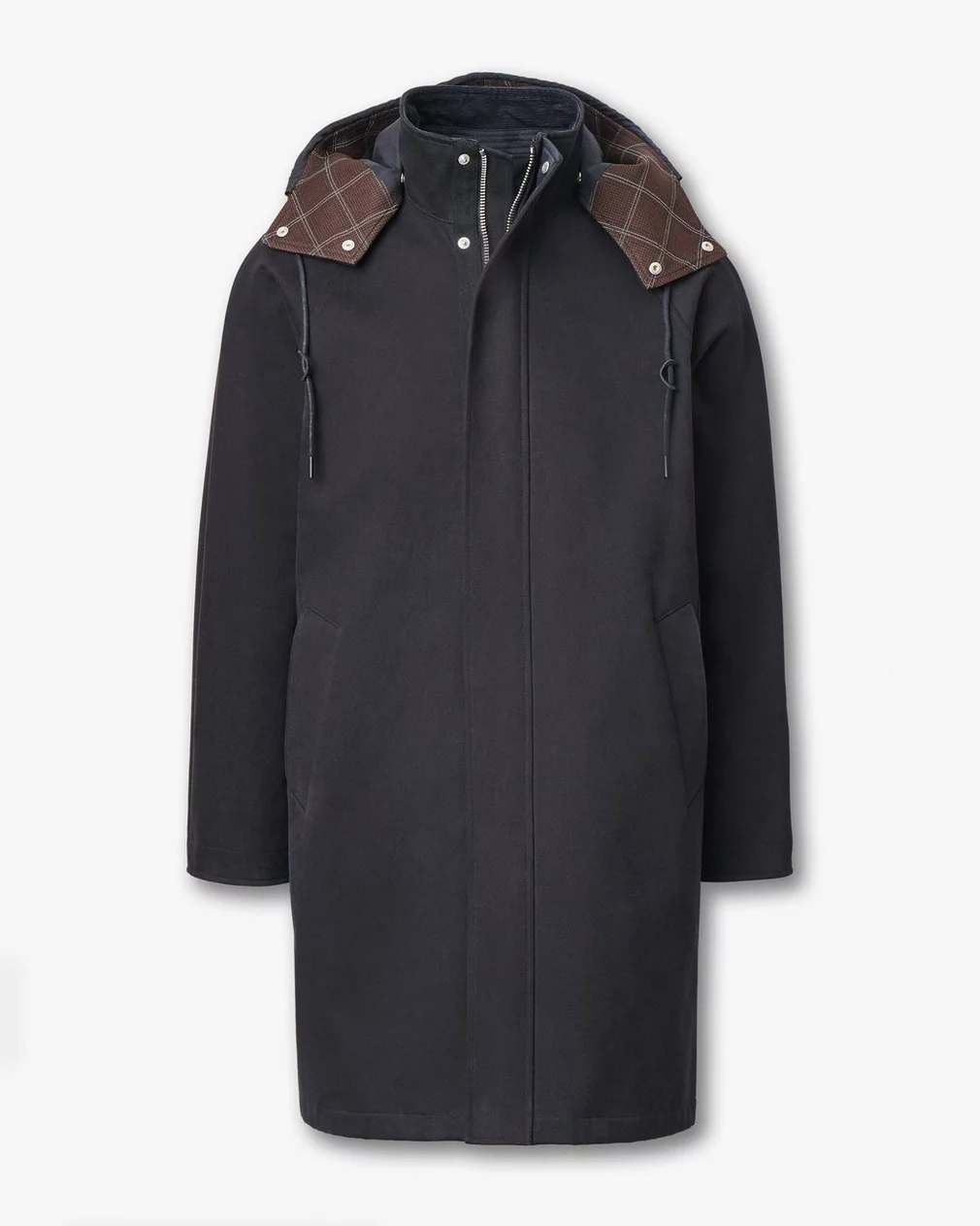 The tonal palette reinforces this discretion. The body is rendered in a rich matte black that absorbs light, softening the coat’s outline and allowing it to adapt easily to any wardrobe context. The tartan-lined hood becomes the only visible contrast—an elegant interior accent rather than an external flourish.