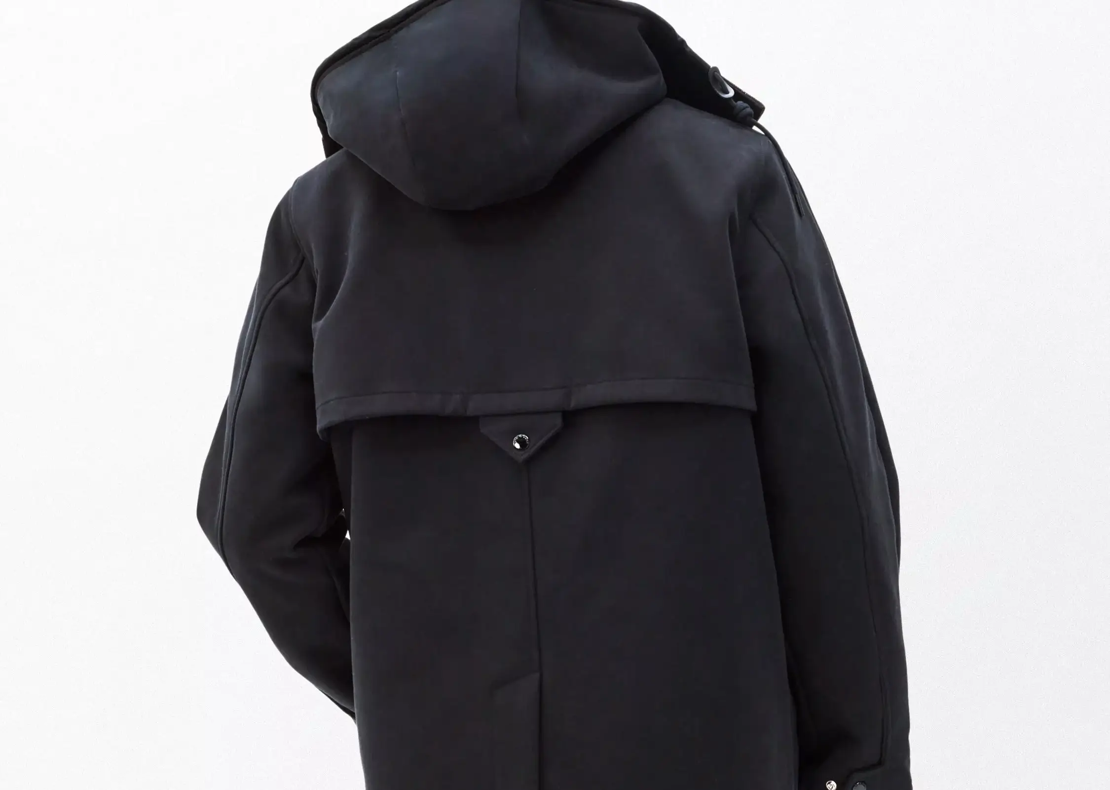 The back reveals a distinctive storm flap, recalling traditional raincoats but executed here with modern restraint. The flap adds dimension to the upper half, subtly breaking the monotony of black while reinforcing the coat’s weatherproofing. Below, a single vent allows natural movement, particularly when layered or worn over heavier knits.