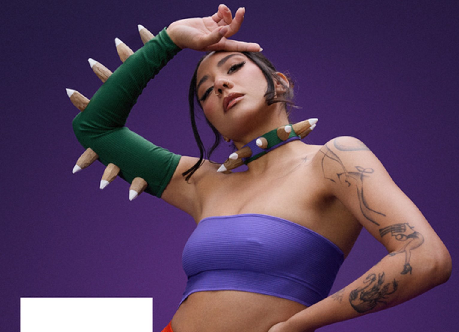 Standing against a deep violet backdrop, dressed in a look created in collaboration with Puerto Rican designers Juan Pablo Vizcaíno Cortijo and Daniela Fabrizi, RaiNao brings “sofocón” to life with an emotional ferocity that is both deliberate and instinctual. It is an image of an artist stepping into her next era — not chasing trends, but expanding her universe from within.