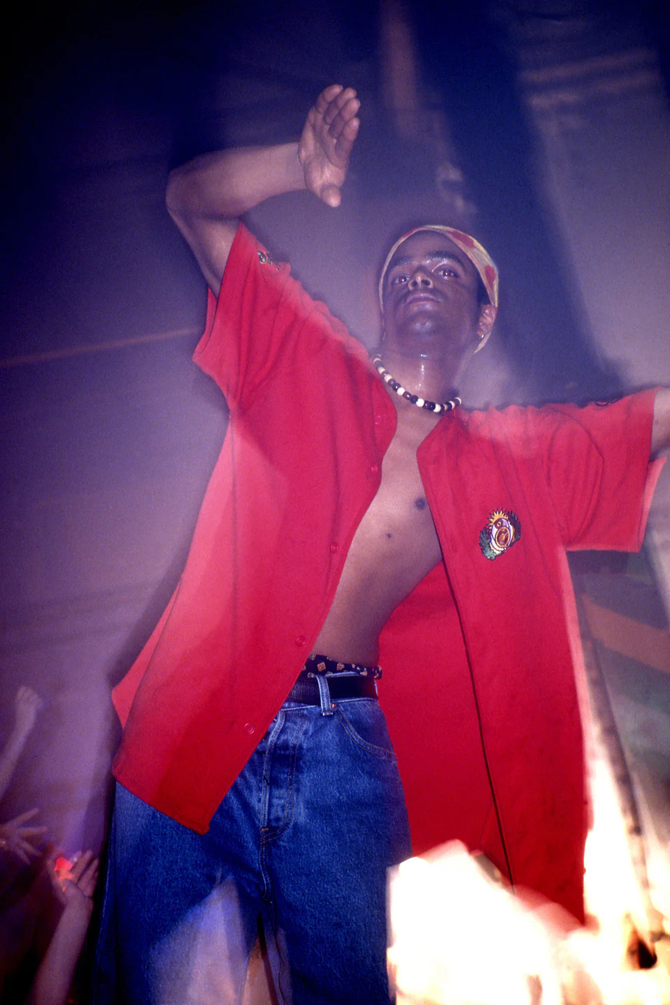 Faces appear mid-transition—eyes closed, expressions suspended between euphoria and exhaustion. Clothing is practical, improvised, often incidental: oversized T-shirts, sportswear, denim, silhouettes that would later become codified as rave uniform. But here, they are still forming.