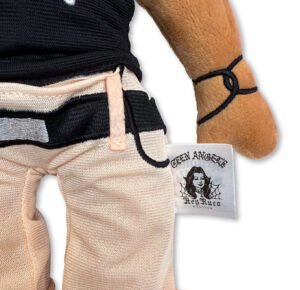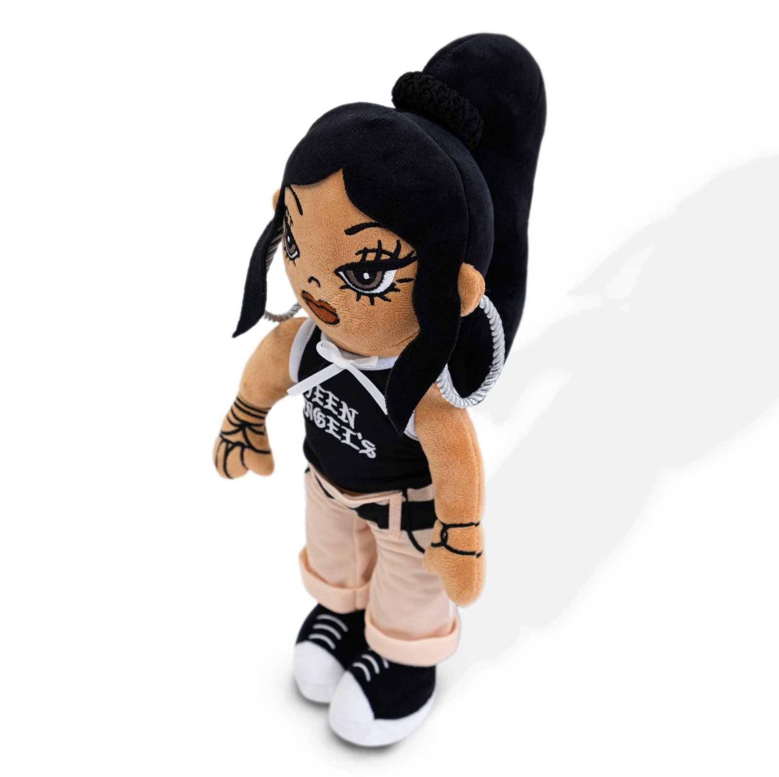 The plush wears a black halter top screen-printed with “Teen Angels” in gothic white lettering—a reference to the magazine’s masthead itself. Her light beige cuffed Dickies-style pants cinch just above classic black sneakers, their white soles stitched in visual rhythm with her rolled cuffs. The hoop earrings, made of coiled silver rope, are not afterthoughts but declarations. They are soft in material but loud in message: we are here, and we are beautiful.