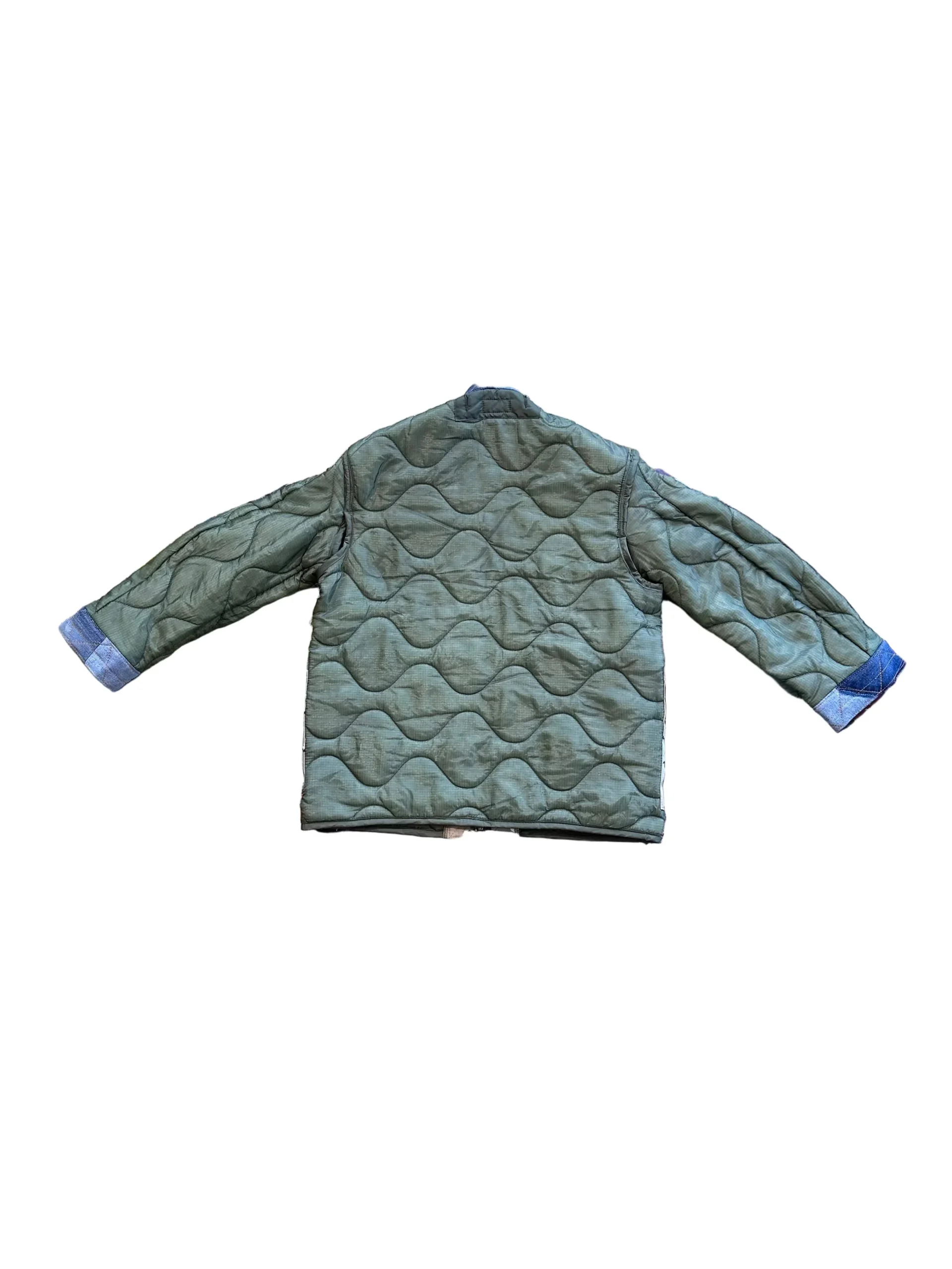 The Choco Chip Camo Kimono embodies this approach. Beginning with a vintage, unisex military shell liner—originally constructed with underarm openings for ventilation—the garment is reconfigured through the addition of a full-length zipper. A utilitarian interior layer becomes an exterior-facing piece, repositioned within a contemporary streetwear framework.