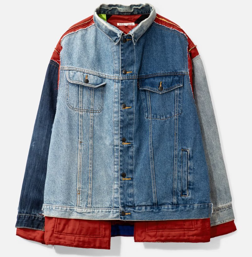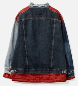 On one side, the jacket features a reconstructed denim exterior made from deconstructed vintage denim pieces. This side typically showcases: