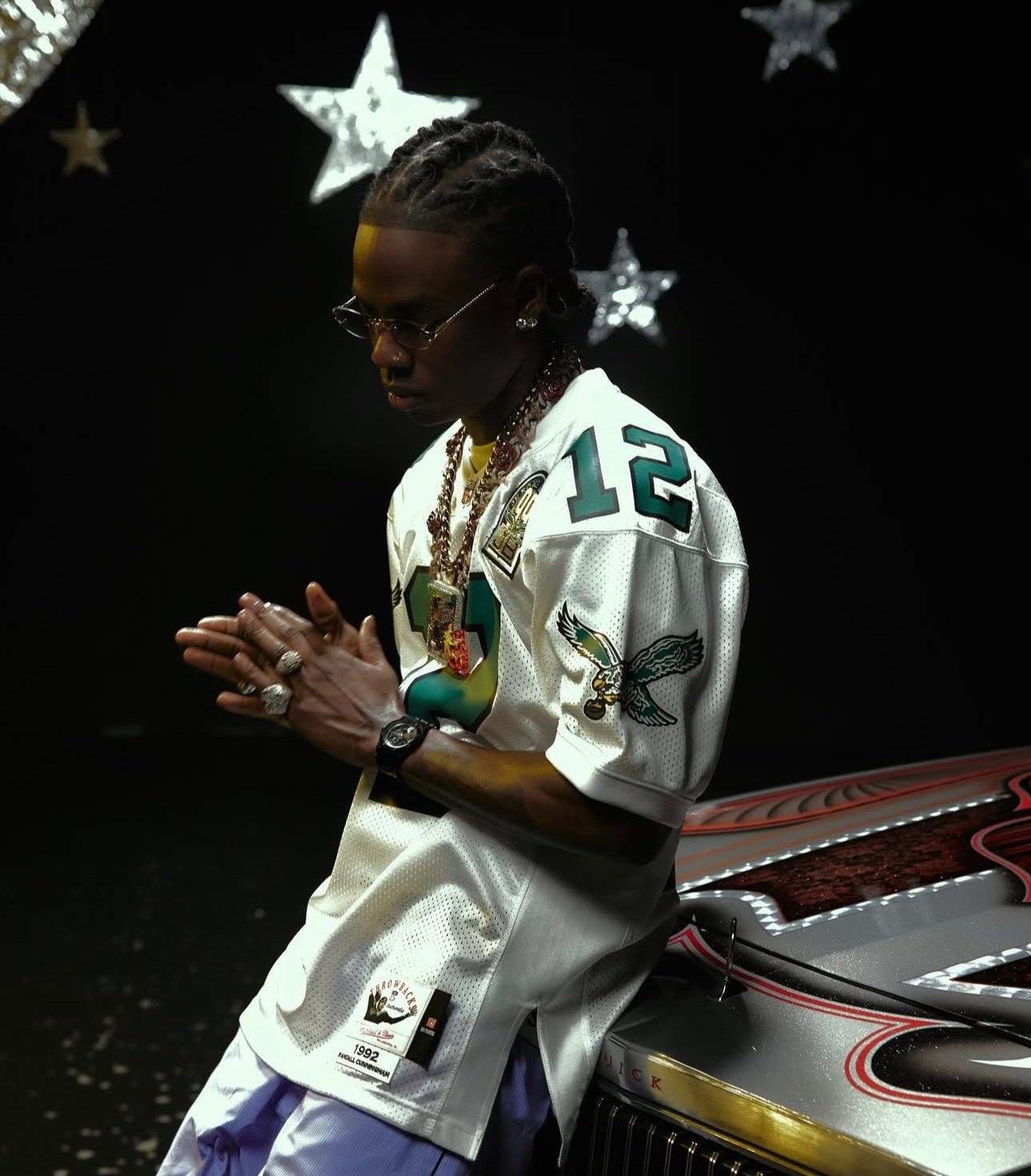Rema’s versatility in fashion is further highlighted in his Mitchell & Ness jersey ensemble. This look leans heavily into sportswear aesthetics, embodying the effortless cool associated with vintage basketball culture. Paired with Timberland boots and Vintage Frames Company glasses, the outfit exudes a relaxed yet stylish vibe.