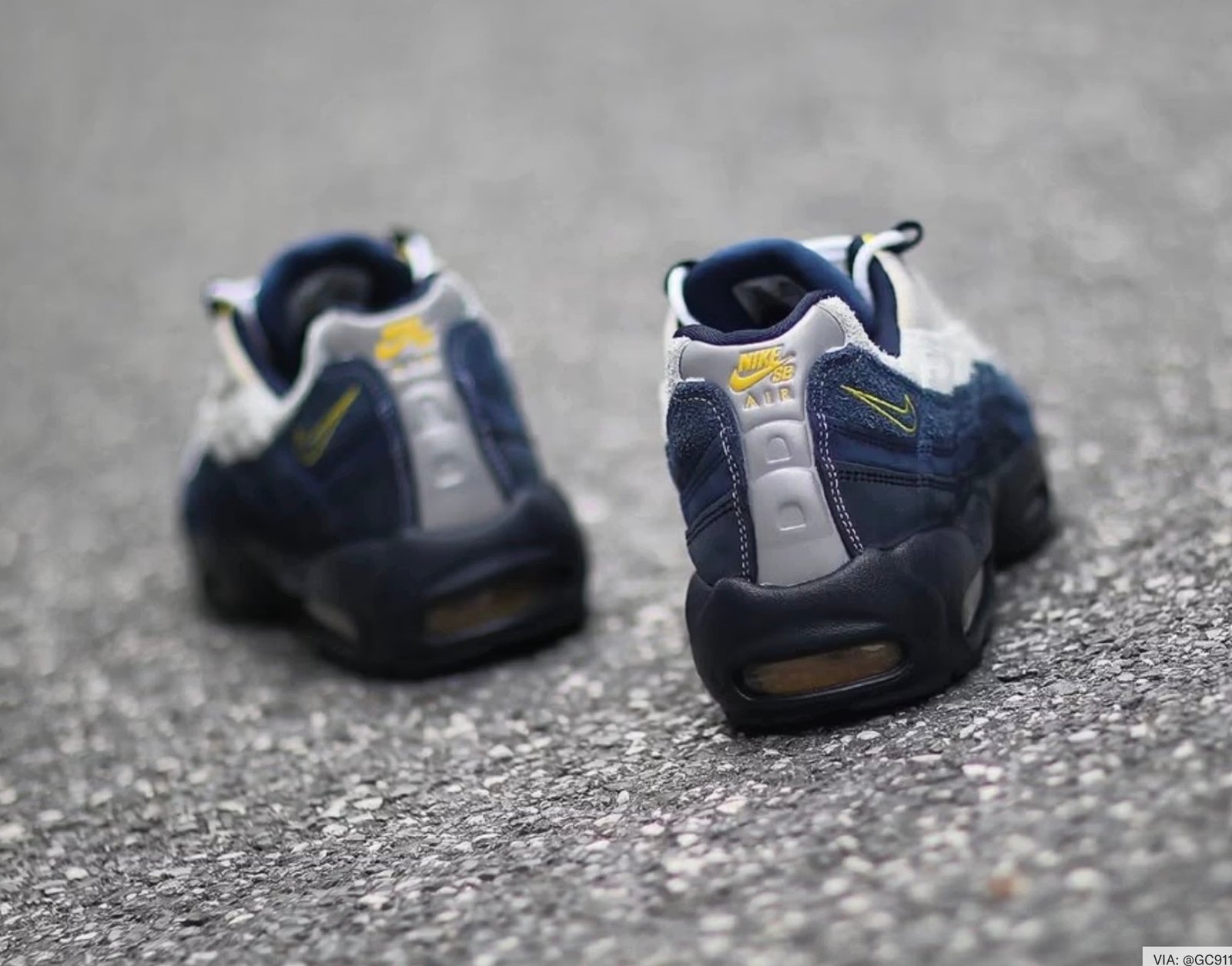 Nike SB’s tweaks make this pair more than a visual remix. The midsole remains faithful to Sergio Lozano’s 1995 design, complete with visible Air units, but underfoot lies a reworked skate-specific tread pattern, tuned for flexibility and board feel. Added cushioning at the insole and slightly adjusted proportions lend the sneaker a sturdier stance while maintaining the comfort that made the Air Max 95 an icon. Small branding cues — including a mini-Swoosh at the heel and an embroidered Nike SB logo on the tongue — anchor it firmly within the SB lineage.
