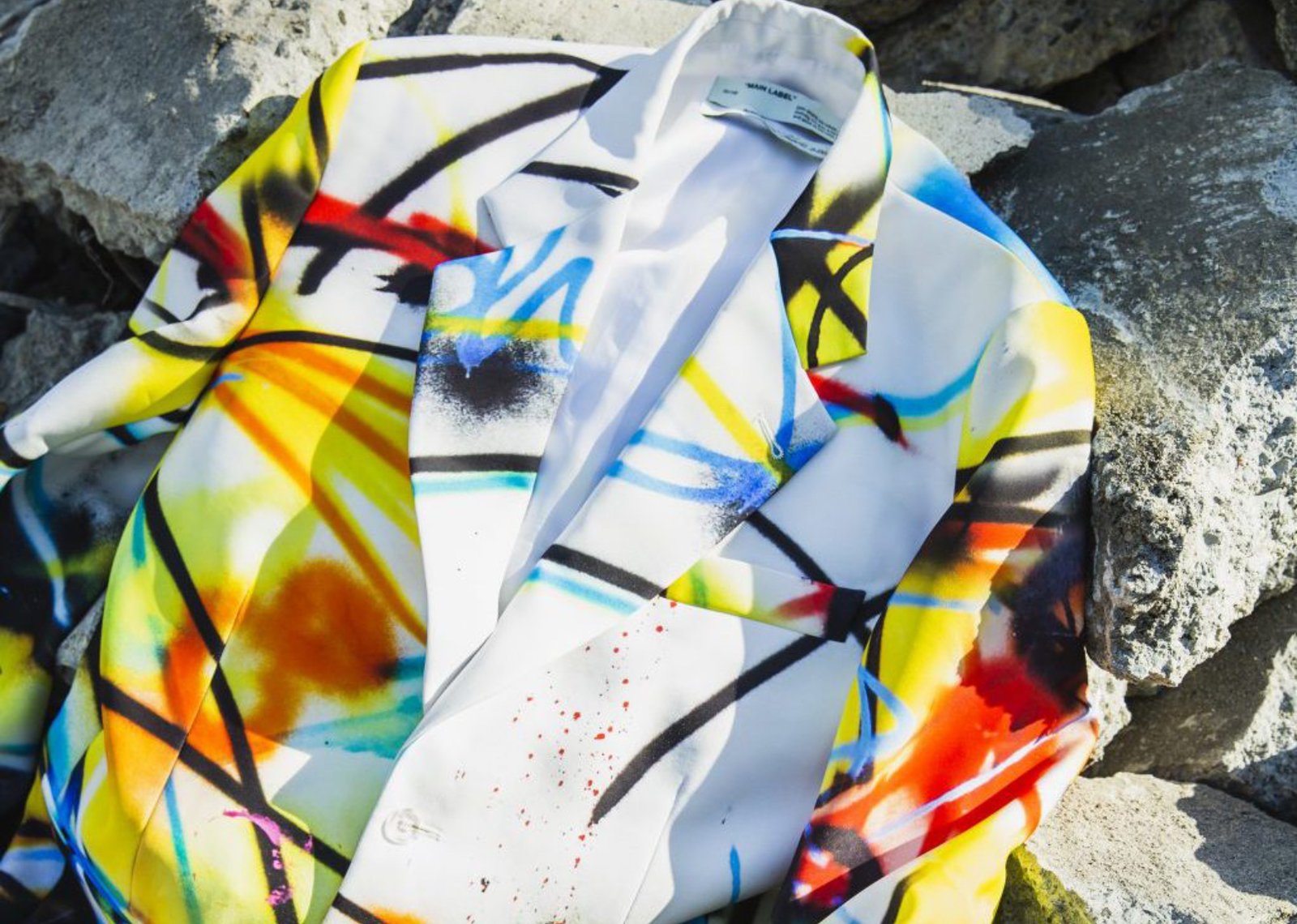 The rocks beneath it are worn and craggy, shaped by time and weather into fractured monuments of stillness. Laid gently over this terrain is a blazer—no ordinary garment, but a rebellion in fiber, a manifesto in cloth. The OFF-WHITE c/o VIRGIL ABLOH™ FUTURA Spray Over Blazer doesn’t sit; it vibrates. Against the pale granite, its wild arcs of yellow, red, blue, and black appear as defiant brushstrokes—a graffiti-stained flag thrust into the ground of fashion’s ongoing revolution.
