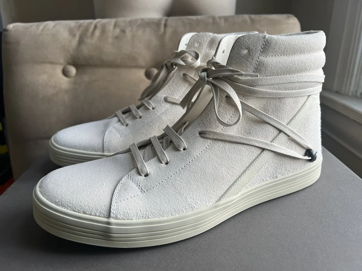 The Rick Owens Off White Milk Suede Leather Geothrasher High Top Sneakers are a quintessential representation of the designer’s avant-garde vision and ability to blend high fashion with streetwear. Through their innovative design, exceptional craftsmanship, and cultural impact, these sneakers exemplify the essence of modern luxury.