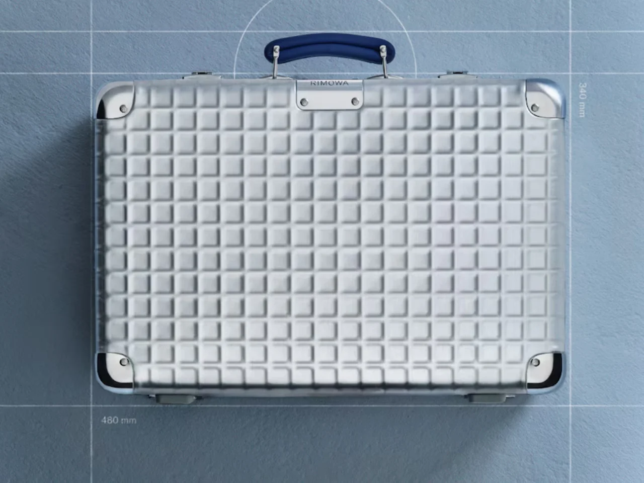 It does not announce itself loudly. From a distance, it reads as a familiar RIMOWA case. Only upon closer inspection does the grid reveal itself, altering the perception of the object.