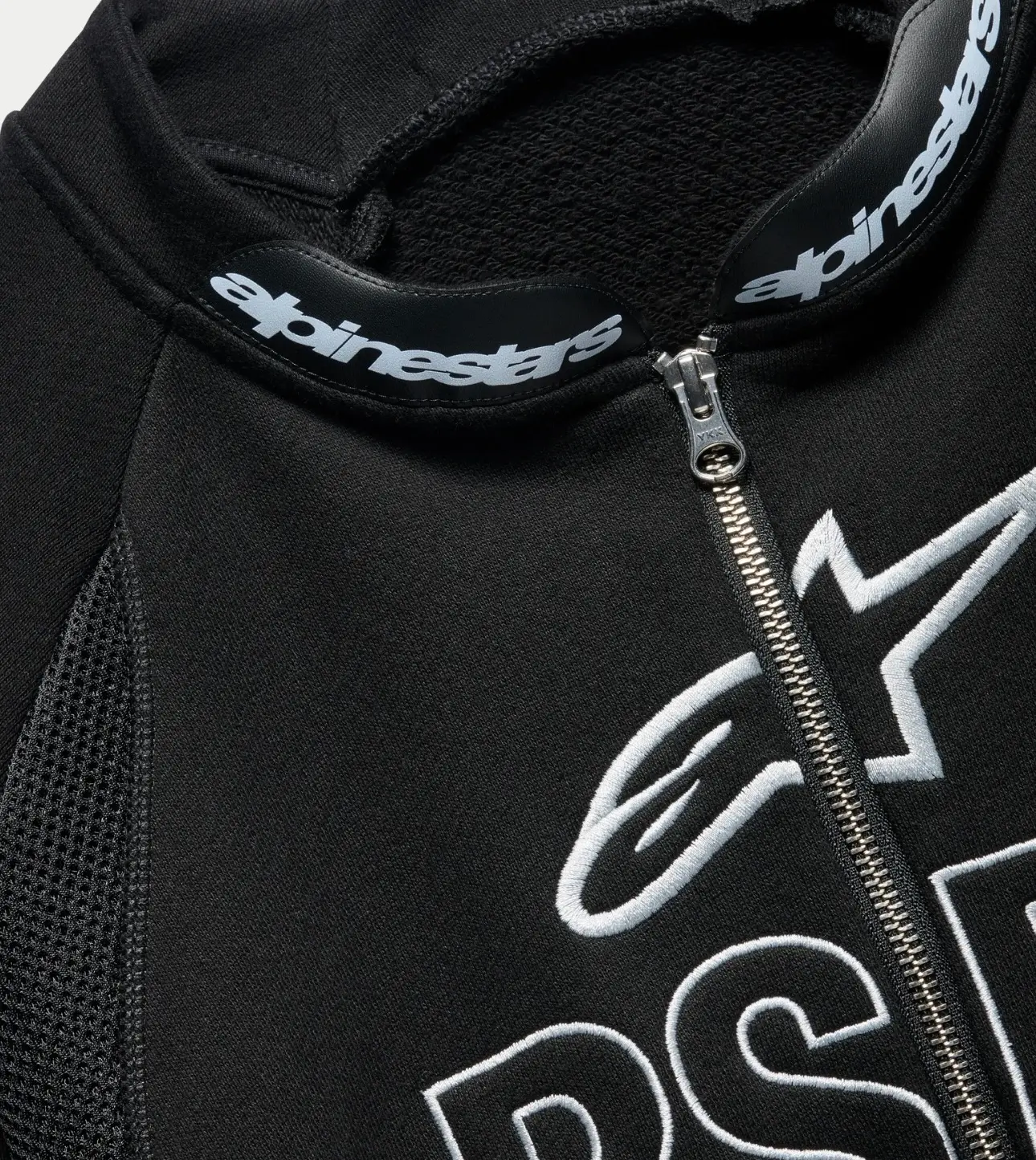 The half-zip at the collar is another motorsport-coded detail. Positioned centrally and finished with a polished metal pull, it allows the neckline to open for airflow or close into a snug, almost balaclava-adjacent shape. Around the collar interior, the Alpinestars wordmark repeats in a continuous loop, transforming what is normally a hidden label into a subtle graphic band.