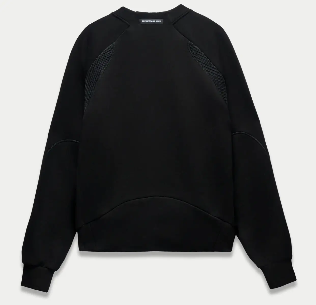 From the rear, the sweatshirt becomes even more minimal. The back panel is free of loud logos, broken only by the same sculptural seam lines and mesh zones found on the front. A small “ALPINESTARS RSRV” label sits at the nape, reinforcing the sense that this is a system garment—part of a wider modular wardrobe rather than a standalone graphic piece.