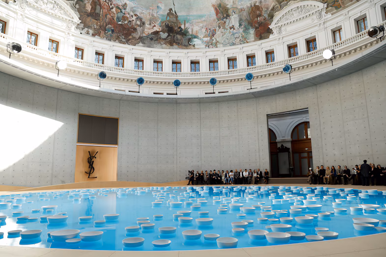 The Bourse de Commerce in Paris is no stranger to quiet revolutions. A monument steeped in centuries of economic transactions, it has been transformed by Tadao Ando into a contemporary art sanctuary. On Tuesday evening, Anthony Vaccarello staged what might be one of his most cerebral and poetic collections yet for Saint Laurent Mens Spring Summer 2026. Here, in a space echoing with the gentle clink of porcelain bowls drifting in Céleste Boursier-Mougenot’s clinamen installation, he offered a meditation on restraint, vulnerability, and redefined masculinity.