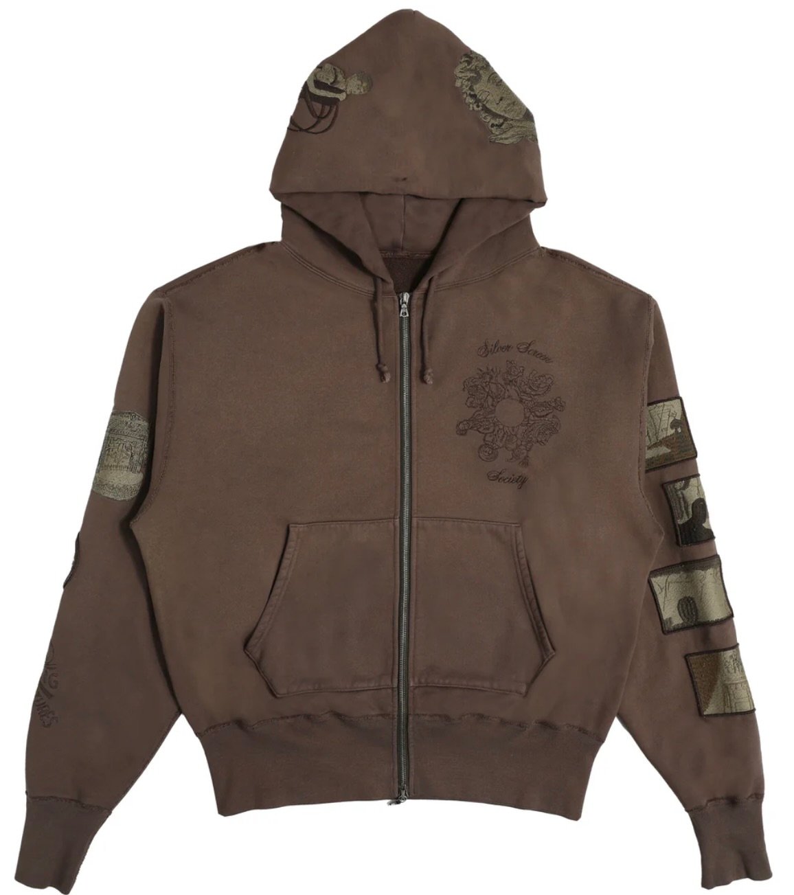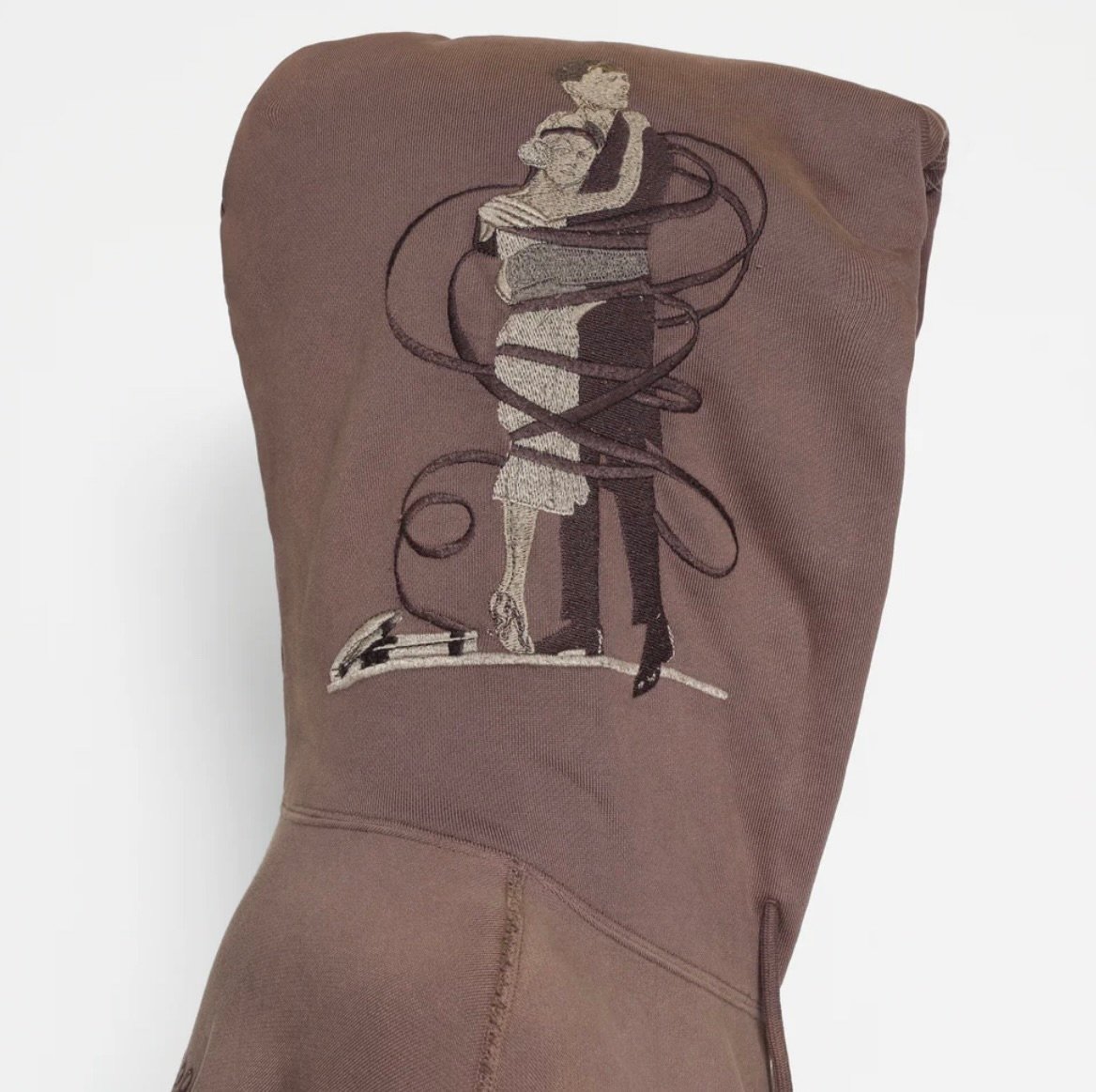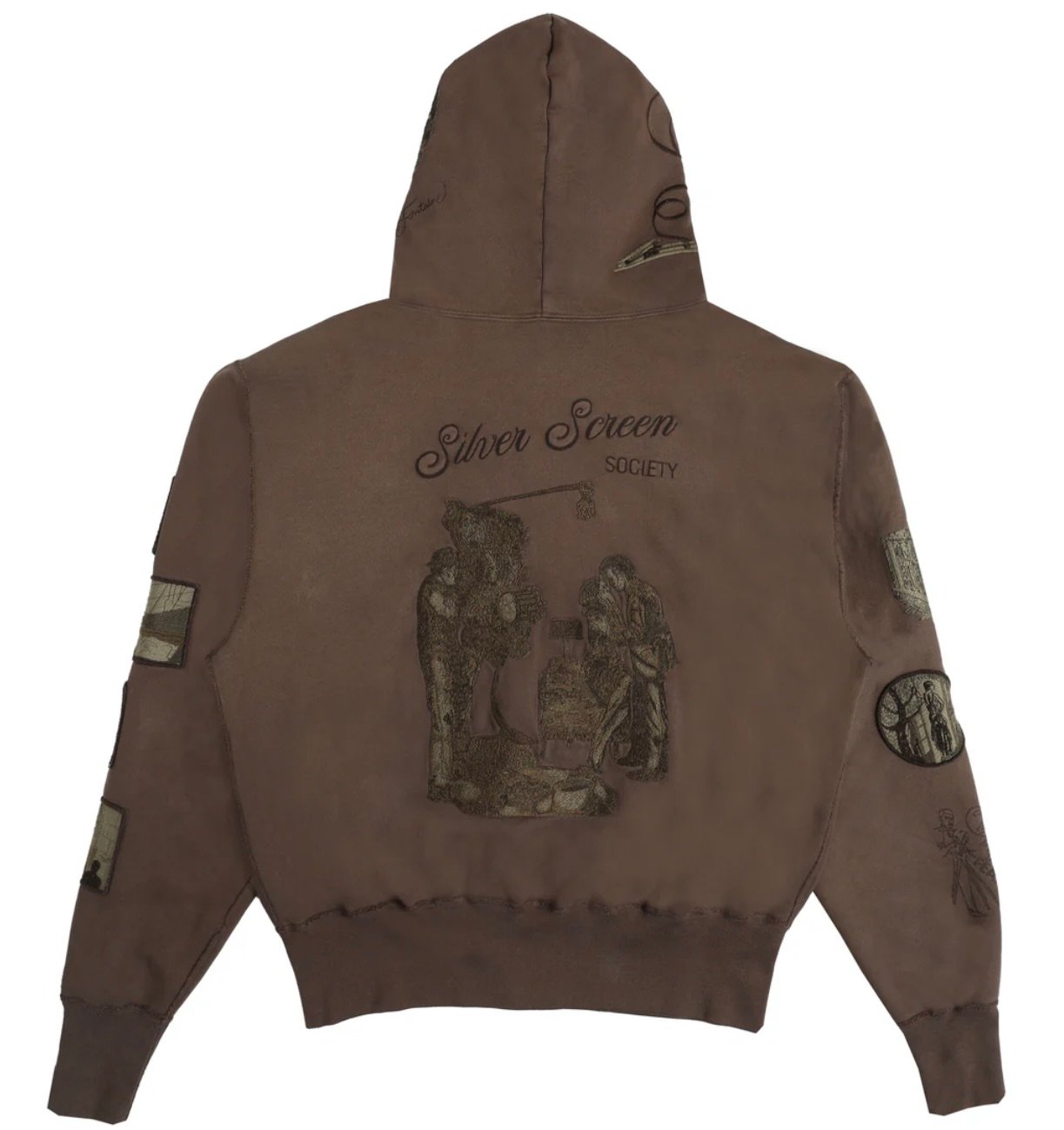 Rather than merely printing this imagery, Zelig embroiders it in tonal threads, fusing sepia shades with soft metallic greys. The result resembles film grain translated into thread — tactile and faintly imperfect. The hoodie’s overall wash, a muted brown that evokes both oxidized celluloid and vintage workwear, anchors this aesthetic.