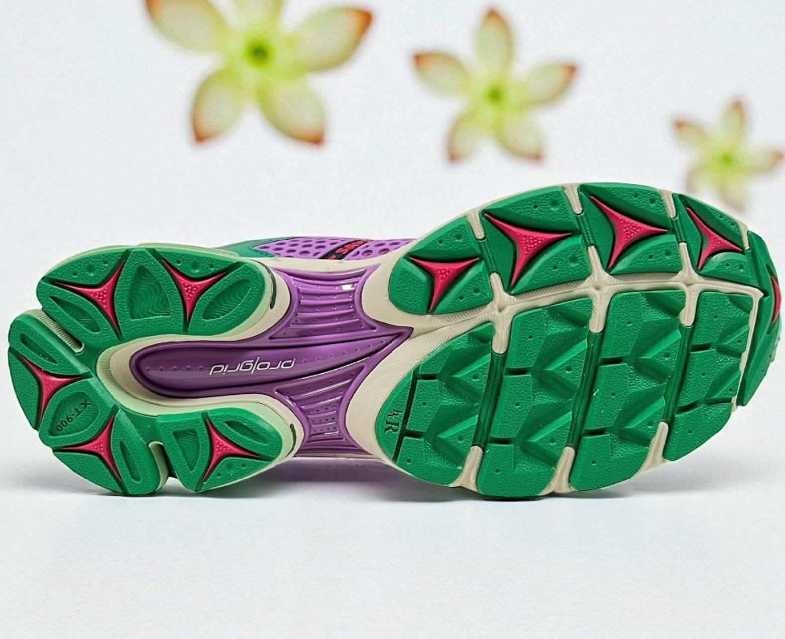 The ProGrid Triumph 4 bursts with texture and symbolism. Each panel — from the soft pink mesh base to the reflective overlays — tells a story of gratitude and growth. The upper features embroidered flowers, a recurring motif in Jae Tips’ Savior Worldwide projects, symbolizing perseverance and beauty through struggle.