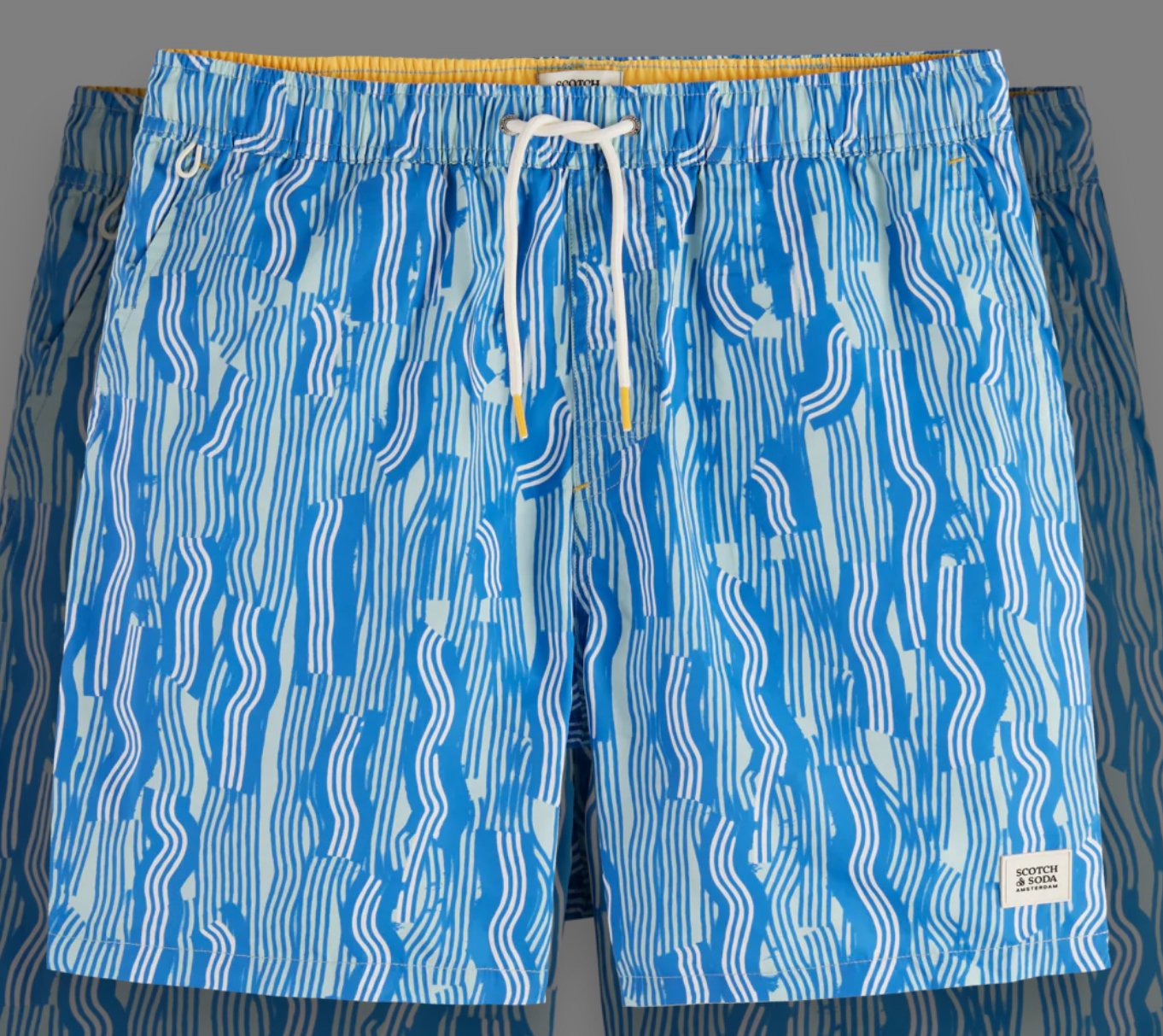 Founded in 1985 and redefined in the early 2000s, Scotch & Soda has long walked the line between refinement and rebellion. Based in Amsterdam, the brand captures a global citizen’s worldview, constantly threading together vintage Americana, French utility, and Dutch design whimsy. Their swimwear, especially this printed mid-length swimshort, offers a distilled expression of that ethos: detailed without being overdone, familiar yet refreshingly eccentric.