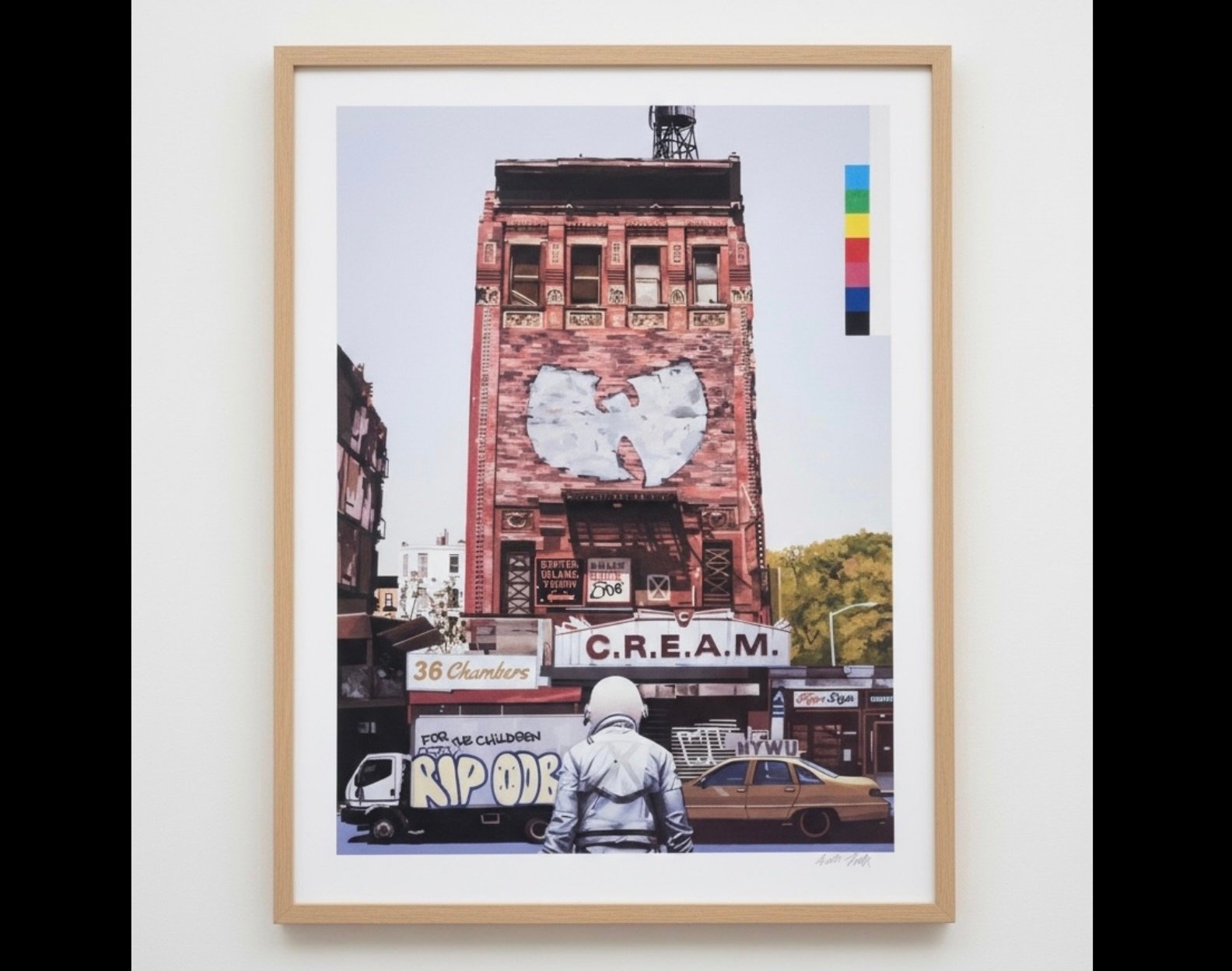 In C.R.E.A.M., the astronaut stands at street level, his white suit pristine against the rough brickwork and urban texture. He faces a building whose façade has become an altar to hip-hop history. Painted across its upper half is the Wu-Tang Clan insignia, faded yet unmistakable, symbolizing both legacy and endurance. The letters “C.R.E.A.M.” appear across the awning below—a direct reference to the group’s 1993 anthem Cash Rules Everything Around Me, one of the most culturally charged statements in hip-hop history.