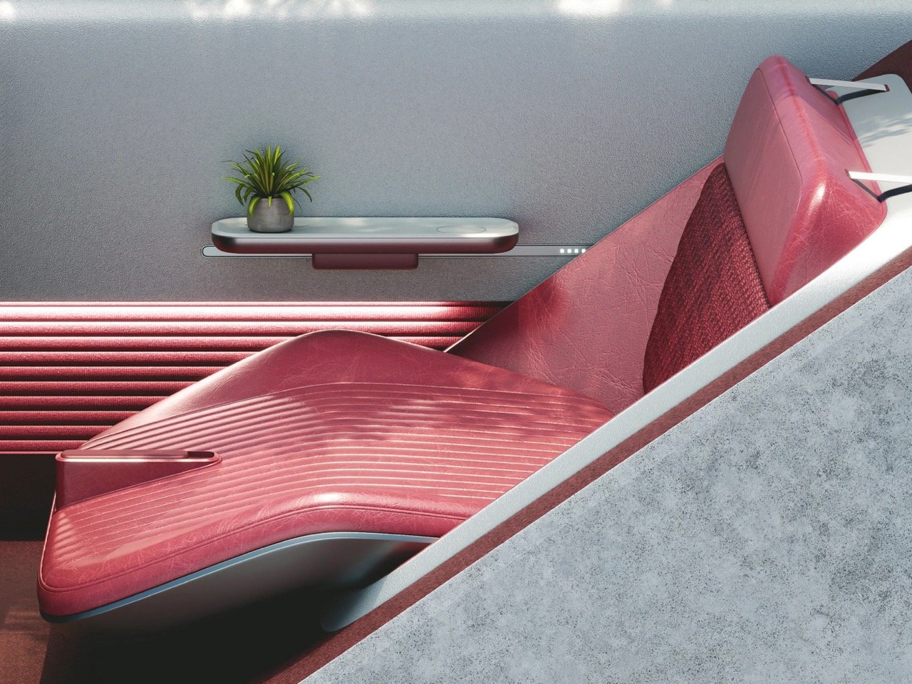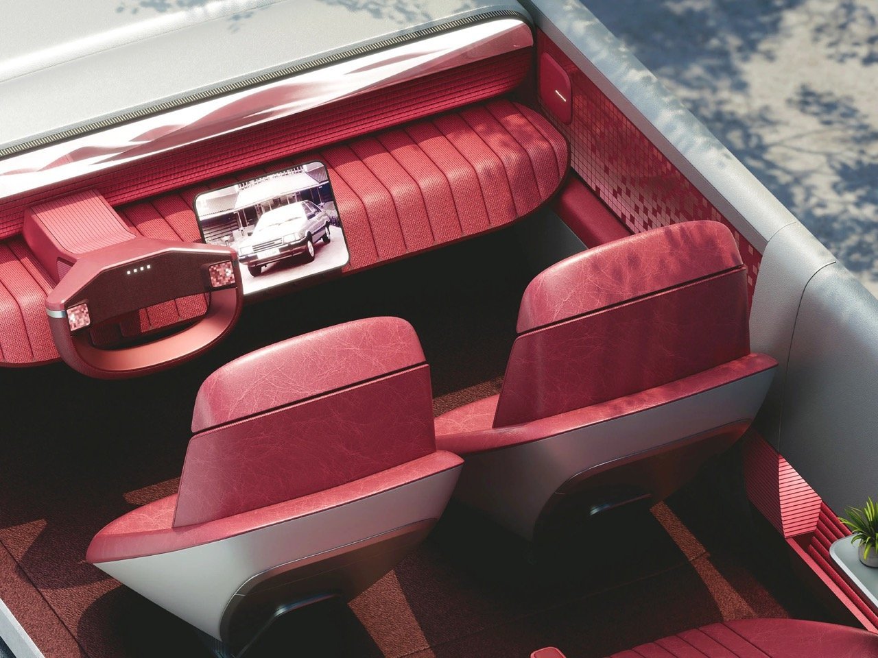 The grid across the nose isn’t simply aesthetic. Conceptually, it frames the vehicle as a screen-based organism — a car designed for an era when interfaces define experience. The lighting pattern could, in theory, communicate status or emotion, blending the language of UI with the physical form of a vehicle.