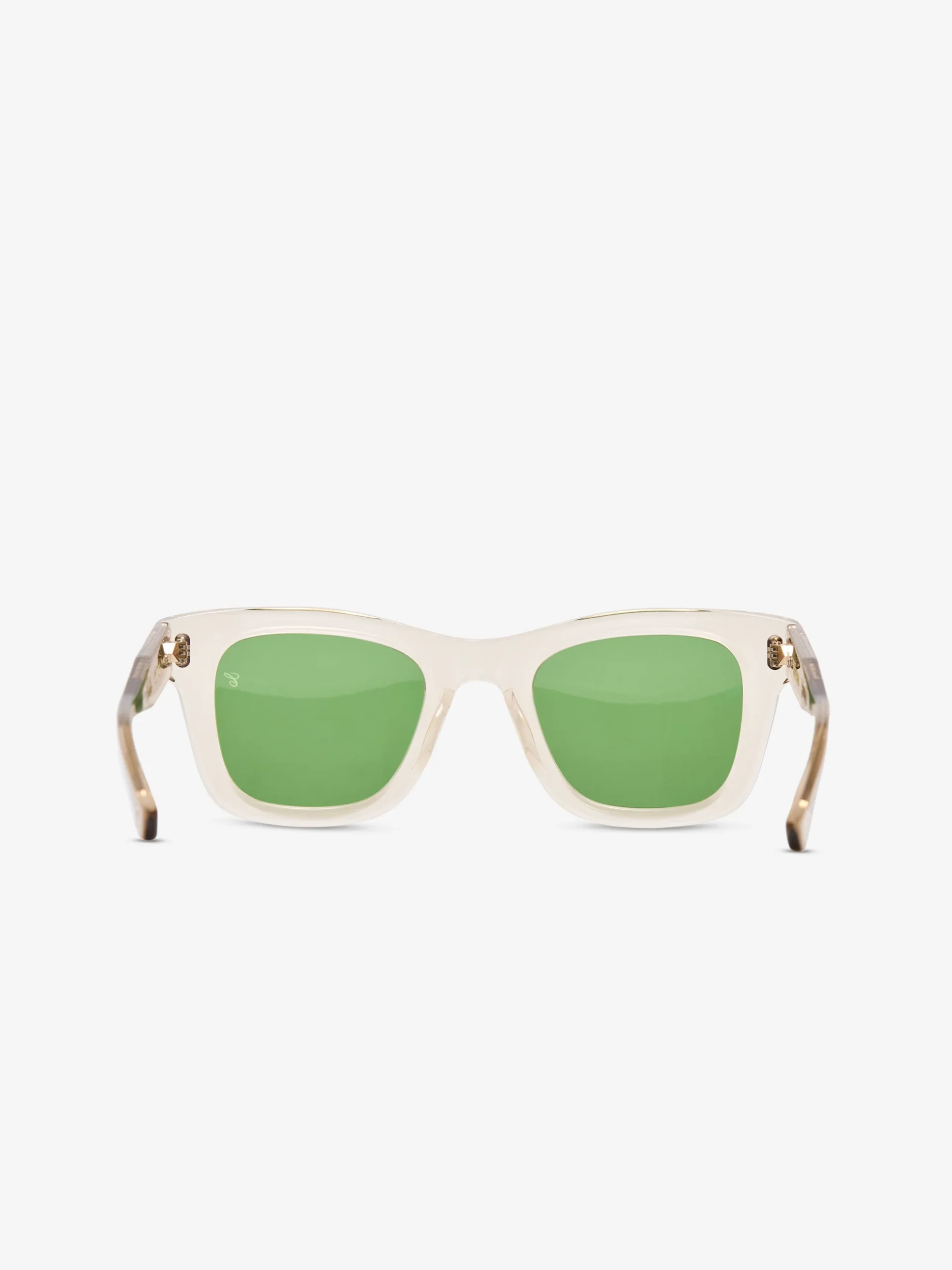 Then the interruption: green lenses. Not dark, not aggressive, but tuned. A softened, almost herbal green that shifts depending on light—cooler in shade, warmer under direct sun. It reframes the neutrality of the frame with just enough tension.