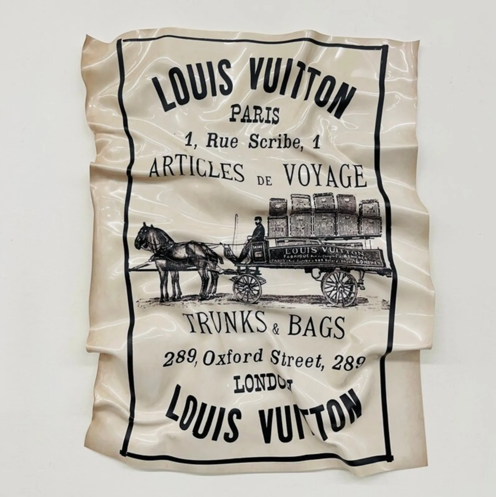At first glance, Oxford street 289 LV reads like a relic pulled from the archive of luxury advertising. Its imagery is immediately legible: a horse-drawn carriage, bold serif typography, and references to Paris and London that anchor the work in the mythology of Louis Vuitton’s origins. Yet the longer one looks, the more the image destabilizes itself. This is not a print, not a poster, not a page torn from a magazine. It is a resin artwork that masquerades as fabric, as paper, as something delicately folded and pinned in time.