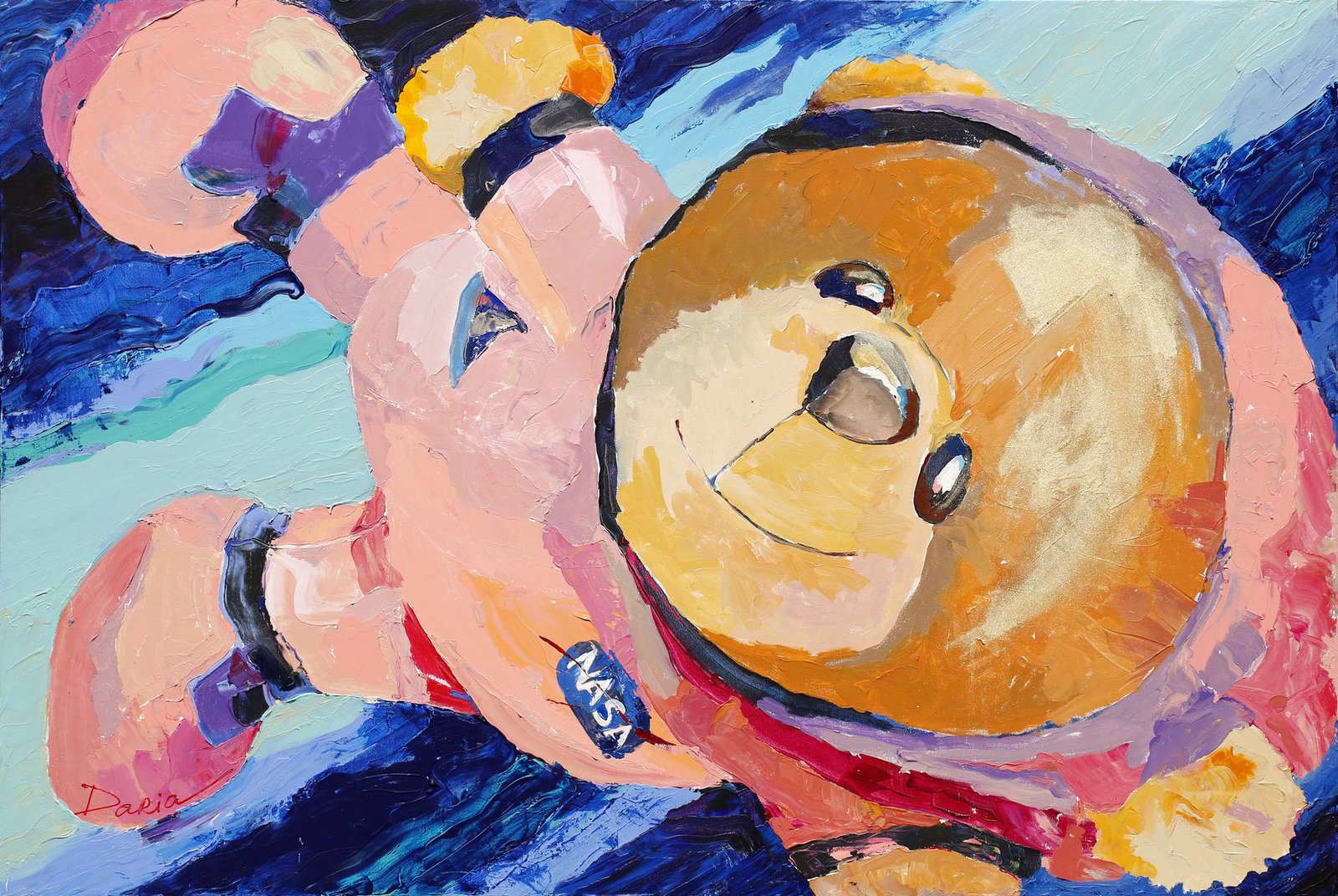 Art has always carried the ability to reconcile paradoxes: the intimate and the universal, the whimsical and the profound, the earthly and the celestial. In Space Bear, a striking acrylic-on-canvas painting by Daria Bagrintseva, these polarities converge in an image that is as playful as it is contemplative.
