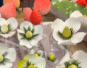 Each element of the display, from oversized strawberries made of fabric and papier-mâché to intricate floral arrangements, was thoughtfully designed and carefully assembled. The process involved sketching initial concepts, selecting color palettes that evoke the vibrancy of spring, and experimenting with textures to achieve a balance between realism and whimsy.