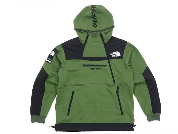 Available in colorways such as black, white, red, and olive green, the sweatshirt caters to diverse style preferences. The bold color-blocking and distinctive design elements pay homage to The North Face’s original Steep Tech line from 1991, reimagined through Supreme’s contemporary lens.