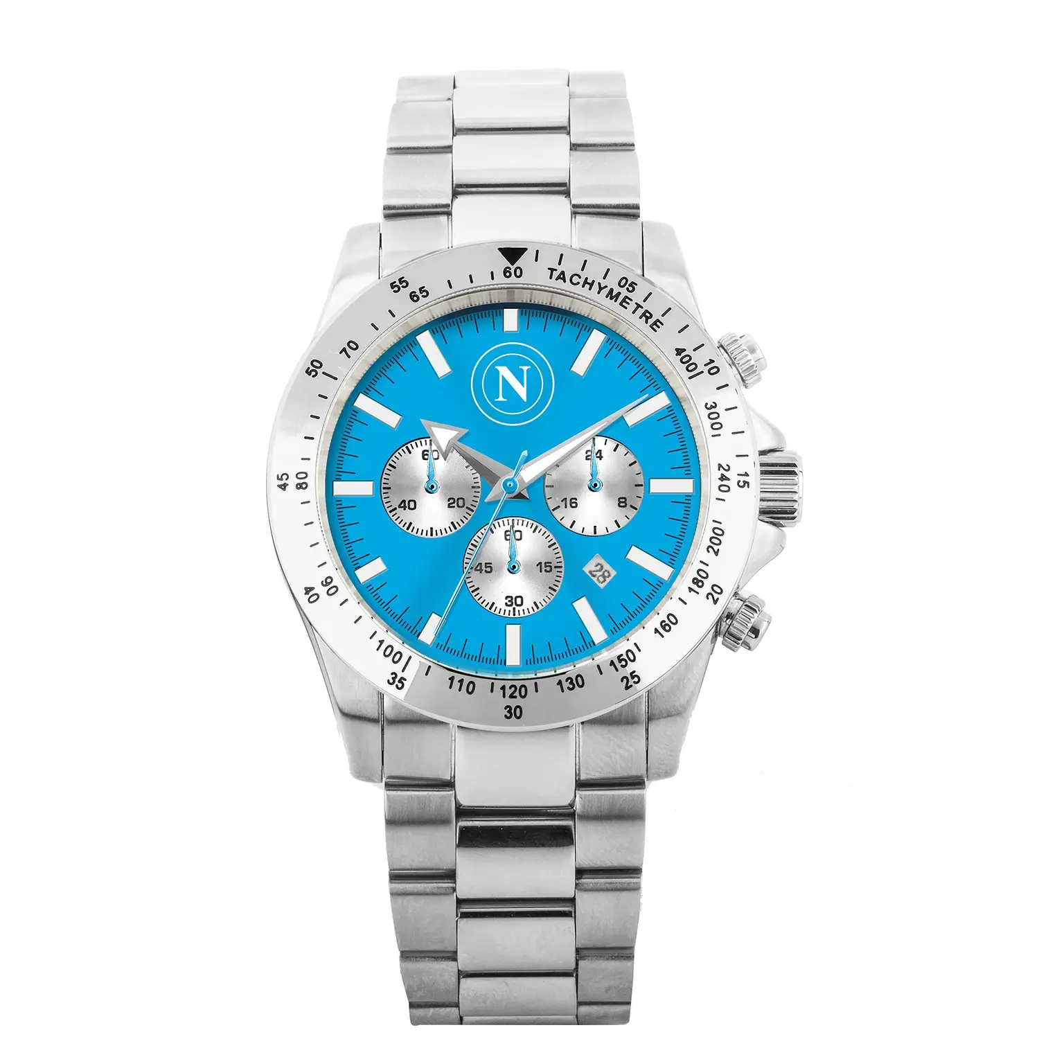 The stainless steel chronograph from SSC Napoli does not arrive with spectacle. It resists it. In a category where sports-branded watches often exaggerate allegiance—oversized crests, loud color blocking, graphic saturation—this piece works differently. It compresses identity into a surface language that is measured, almost architectural.