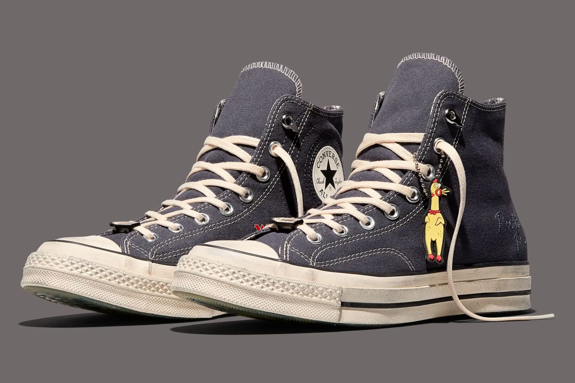 Aged details make it feel lived in. Broadcast graphics make it feel haunted. The rubber chicken makes it feel mischievous. And the Chuck 70 silhouette grounds everything in decades of cultural credibility.