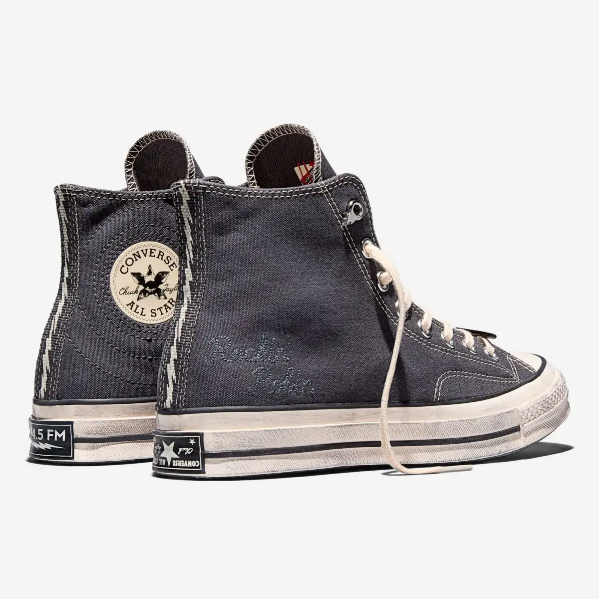 The laces follow the same lived-in logic—light, near-bone in color, loosely textured, and threaded through classic metal eyelets that anchor the silhouette back in its athletic origins. The Chuck 70 foxing—thicker, sturdier, more premium than the standard Chuck Taylor—provides structure and serves as a canvas for even more details. Around the heel, the rubber license plate displays custom WSQK 14.5 FM graphics, adding the signature broadcast motif that defines the collaboration.