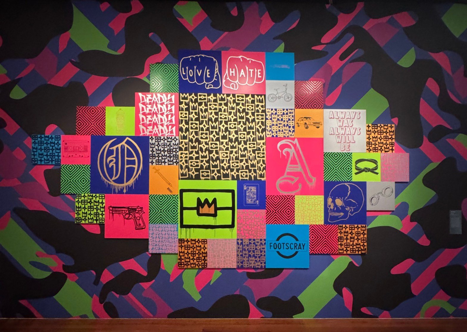 The exhibition was immersive, with themes woven throughout rather than displayed chronologically. Visitors were greeted by Rennie’s bold neon works, intricate sculptures, and vibrant murals, all of which celebrated his Kamilaroi heritage while addressing broader issues of colonialism, identity, and resistance.
